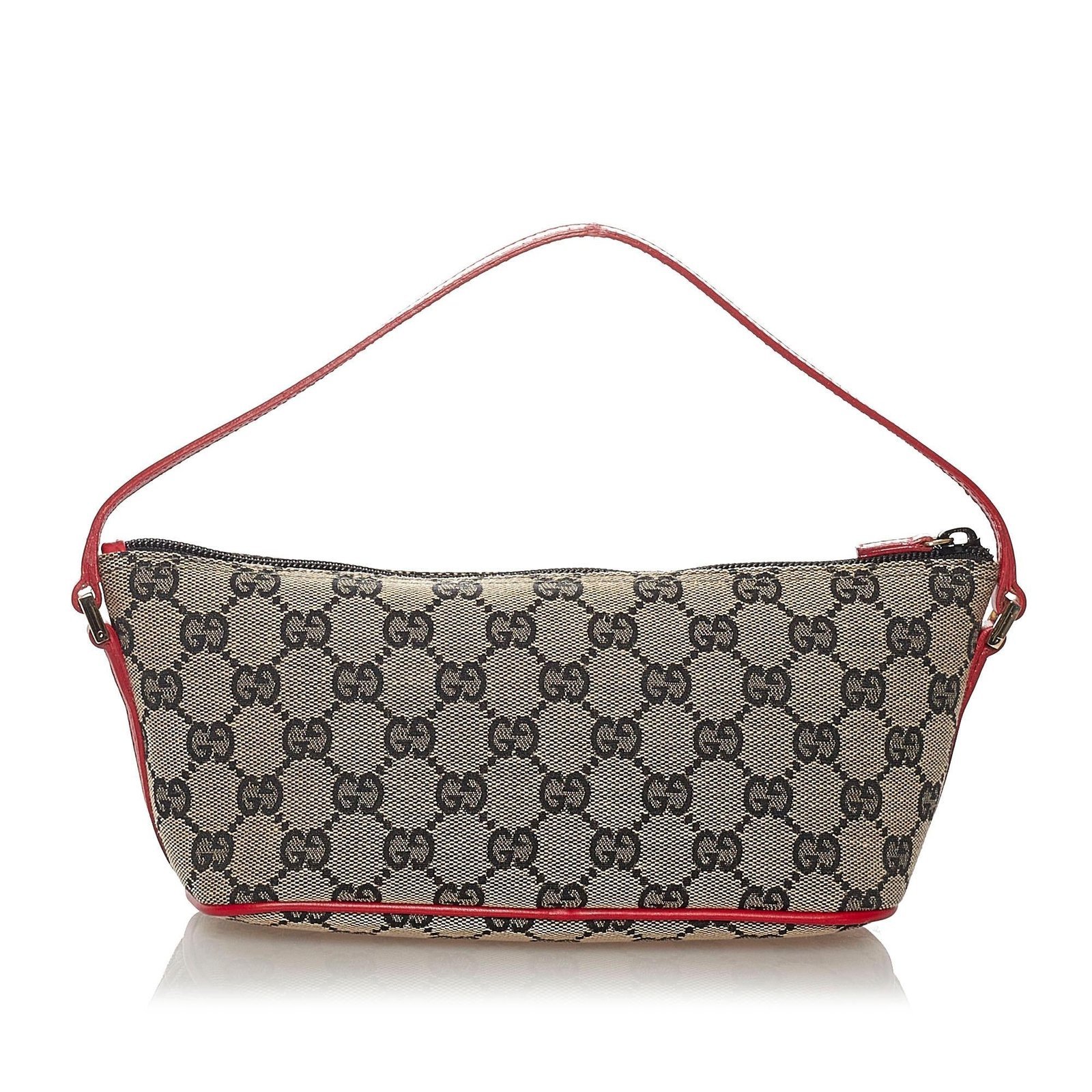 The Gucci GG Canvas Boat Baguette is a refined and versatile bag, crafted from GG canvas and smooth leather in an elegant grey and red palette. Its compact yet structured silhouette exudes understated sophistication, making it a perfect accessory for both casual outings and stylish occasions. The top handle allows for comfortable hand-carry, while the interior is thoughtfully lined to keep your essentials organized and easily accessible.