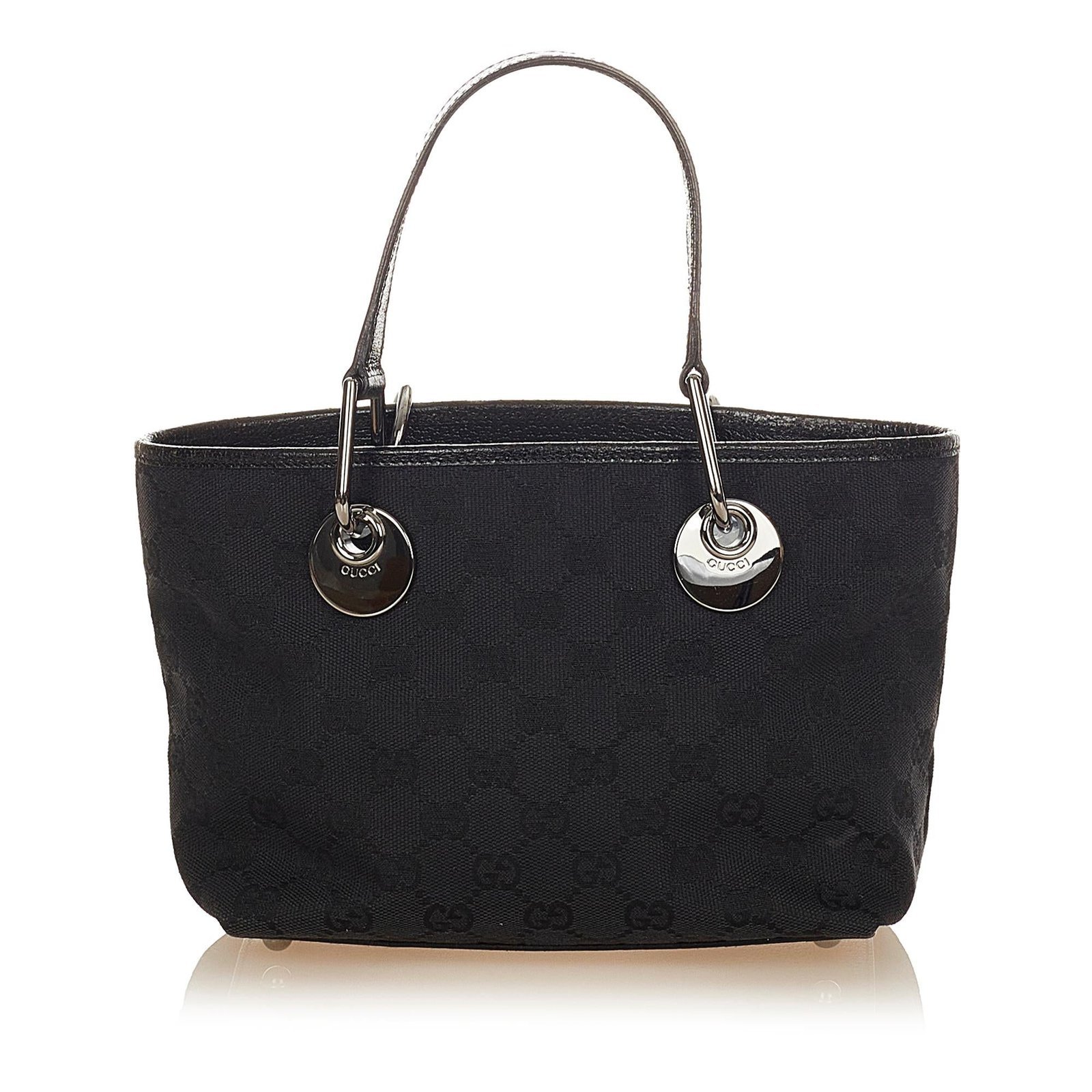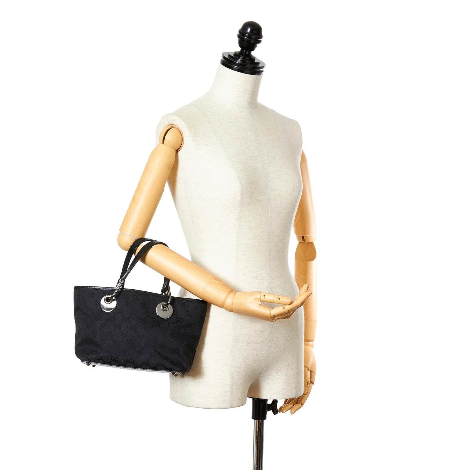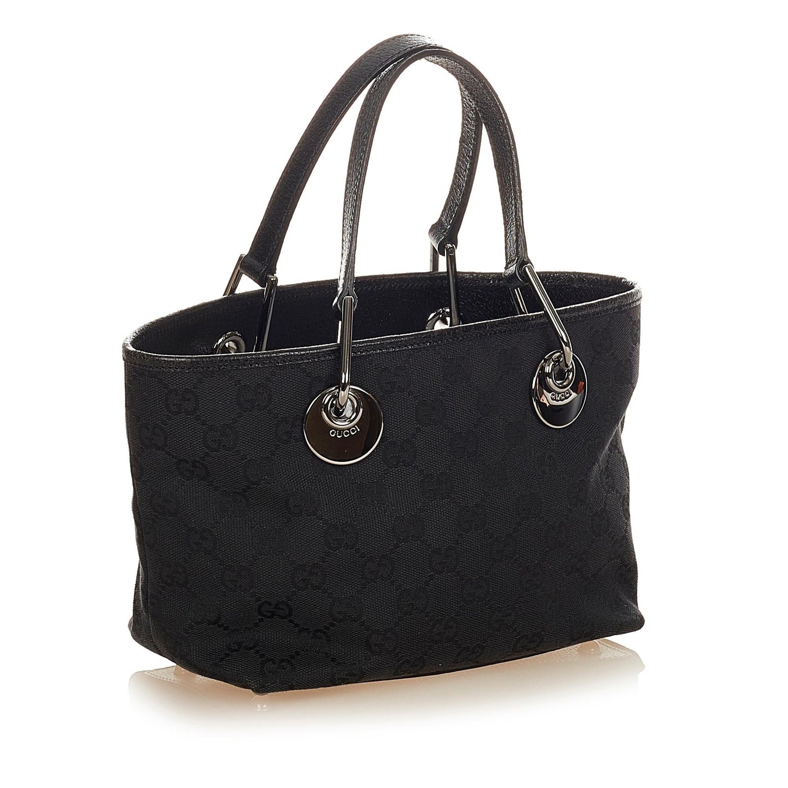 The Gucci GG Canvas Eclipse Shoulder Bag is a sleek and versatile accessory, crafted from GG canvas and premium fabric in a classic black hue. Its structured silhouette combines elegance with practical functionality, featuring flat leather handles for comfortable hand or crook-of-arm carry. The interior is thoughtfully lined with zip and slip pockets for organized storage, while an open-top design allows easy access to essentials. Subtle gold-tone hardware accents complete the refined look.