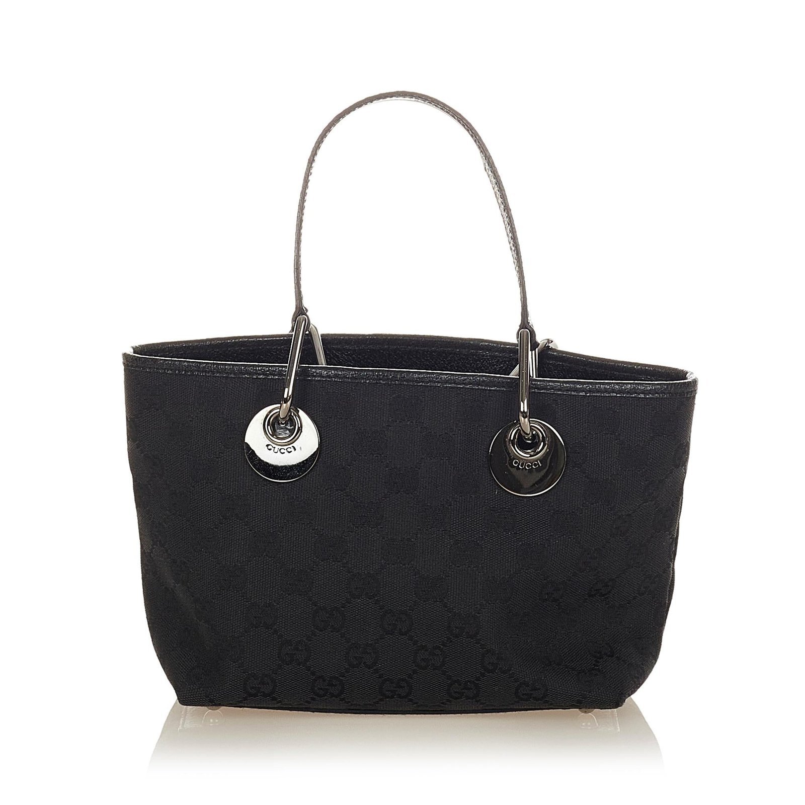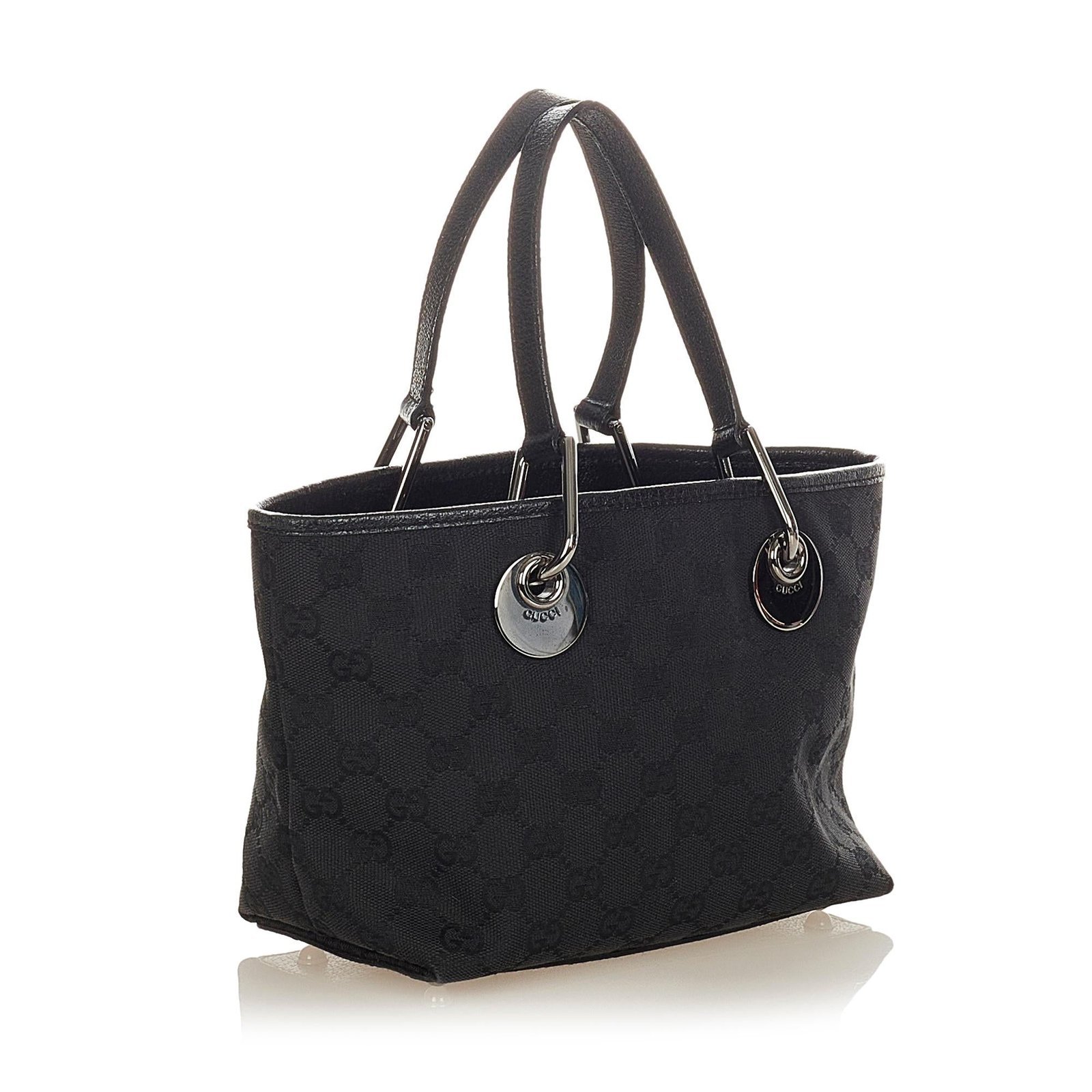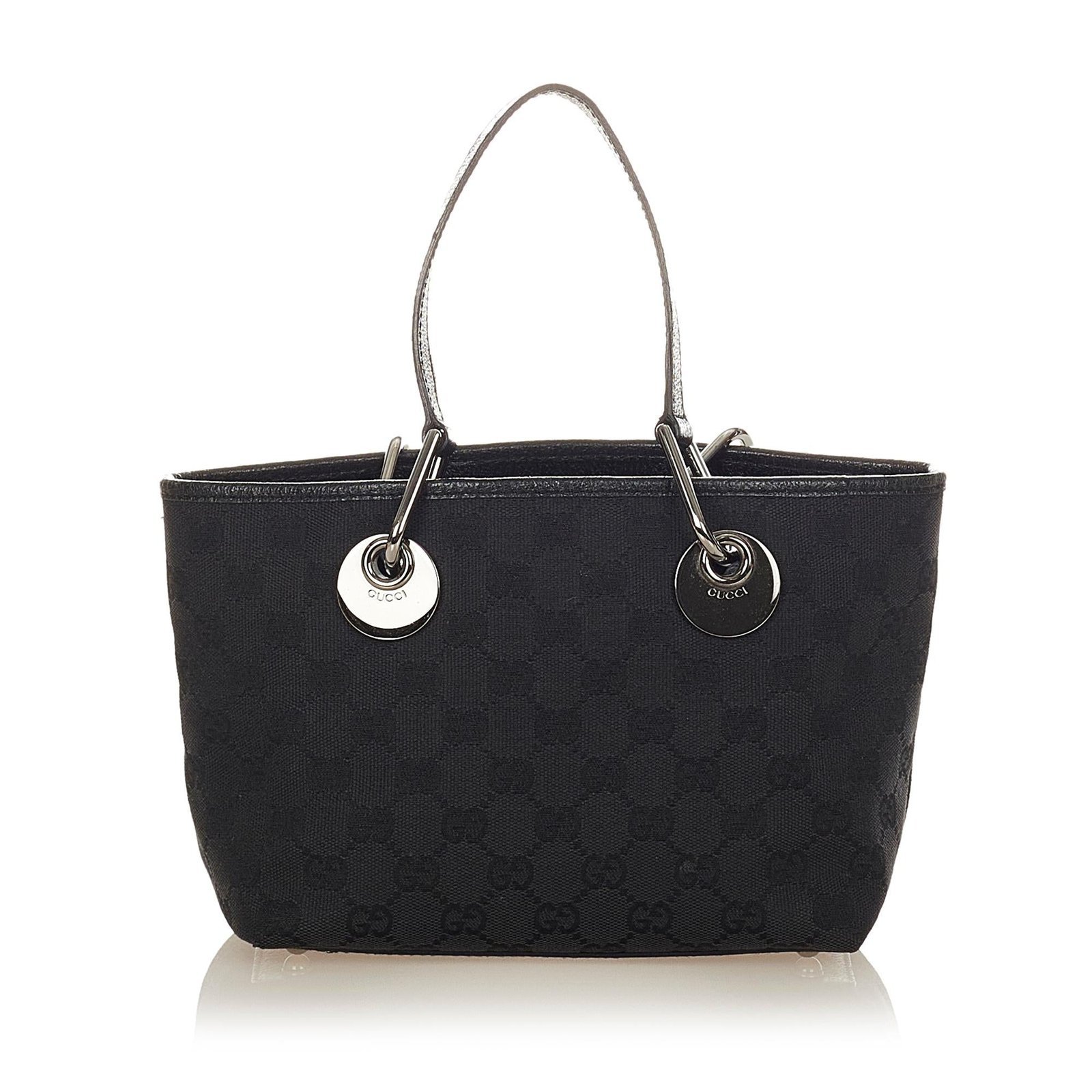 The Gucci GG Canvas Eclipse Tote Bag is a sleek and versatile accessory, crafted from GG canvas, leather, and pony-style calfskin in a classic black palette. Its structured tote silhouette combines timeless elegance with practical functionality, featuring flat leather straps accented with silver-tone hardware for comfortable shoulder carry. The interior is thoughtfully lined with zip and slip pockets for organized storage, while the open-top design allows easy access to daily essentials. Signature studs and subtle hardware details complete the refined design.