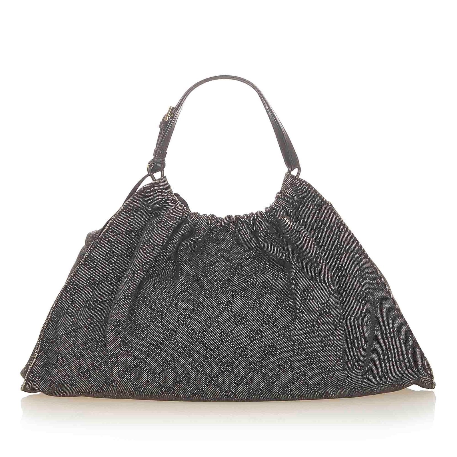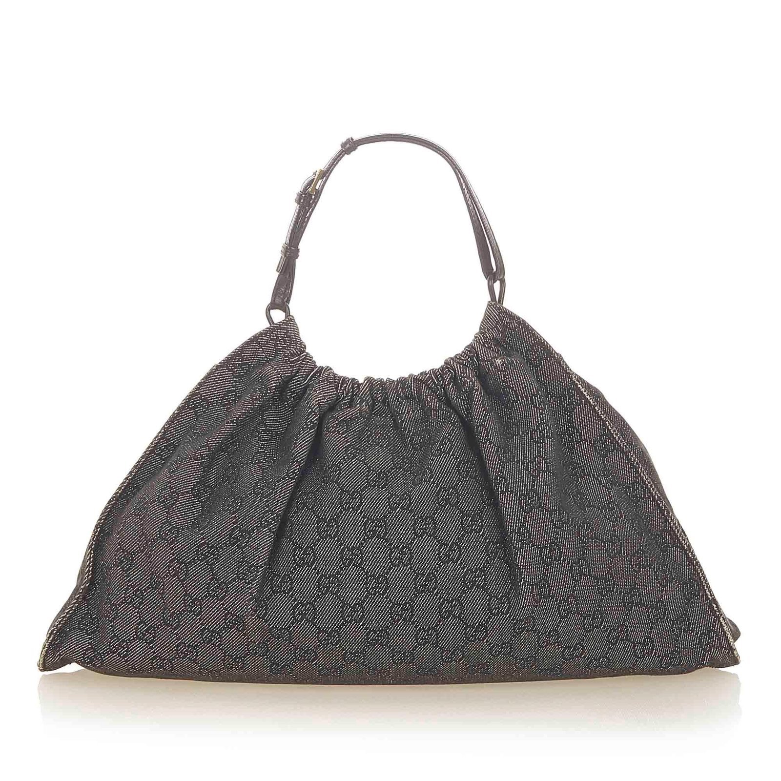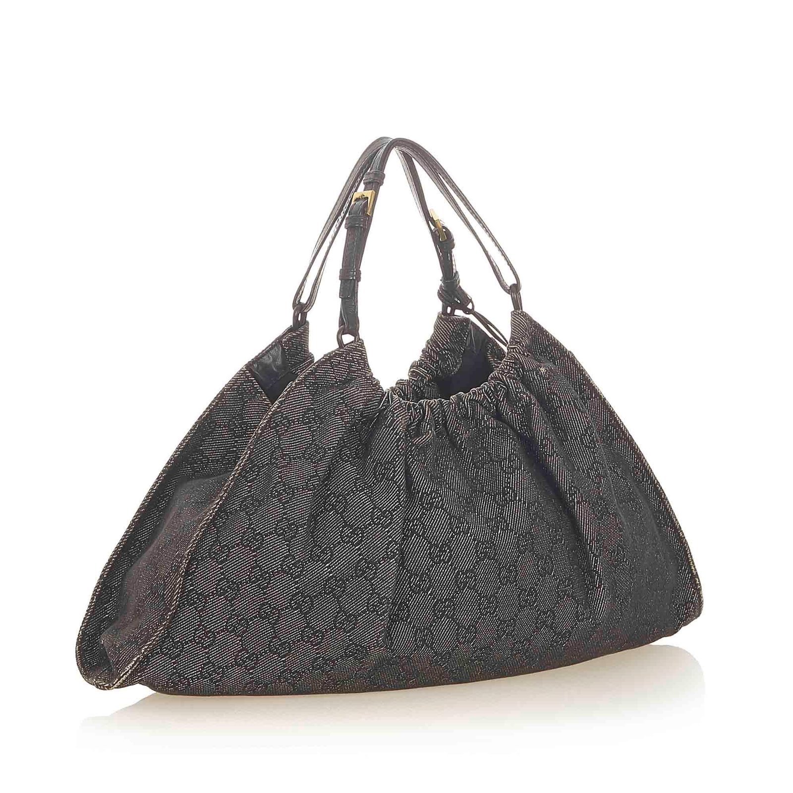 The Gucci GG Canvas Handbag is a sophisticated and versatile hobo, crafted from durable black denim and leather with dark ruthenium hardware accents. Its structured yet relaxed silhouette combines style with practicality, featuring a top opening for easy access to essentials. The interior is lined with nylon, offering organized storage for daily necessities. Perfect for everyday use, this designer hobo effortlessly transitions from work to casual outings while showcasing classic Gucci craftsmanship.