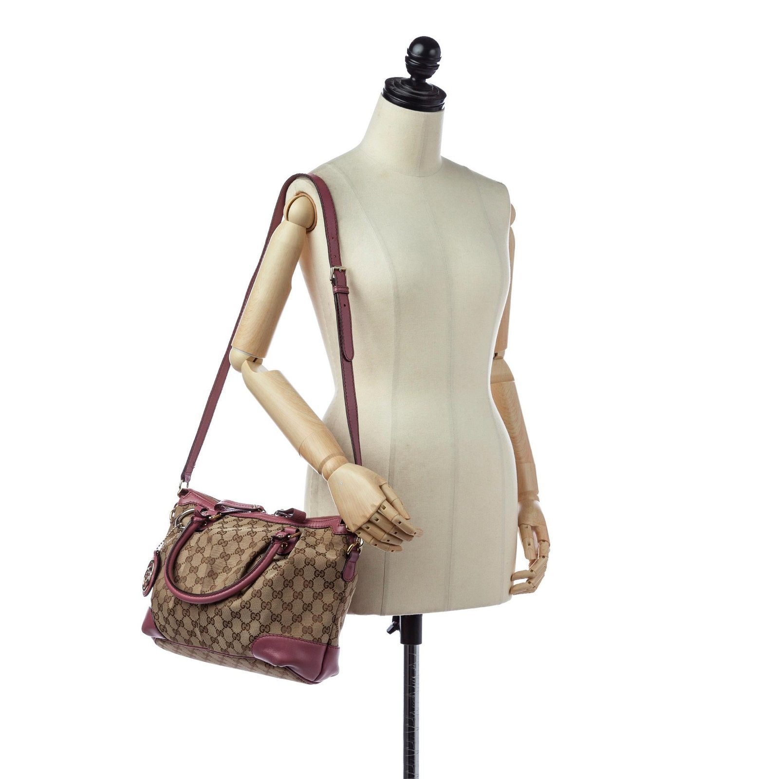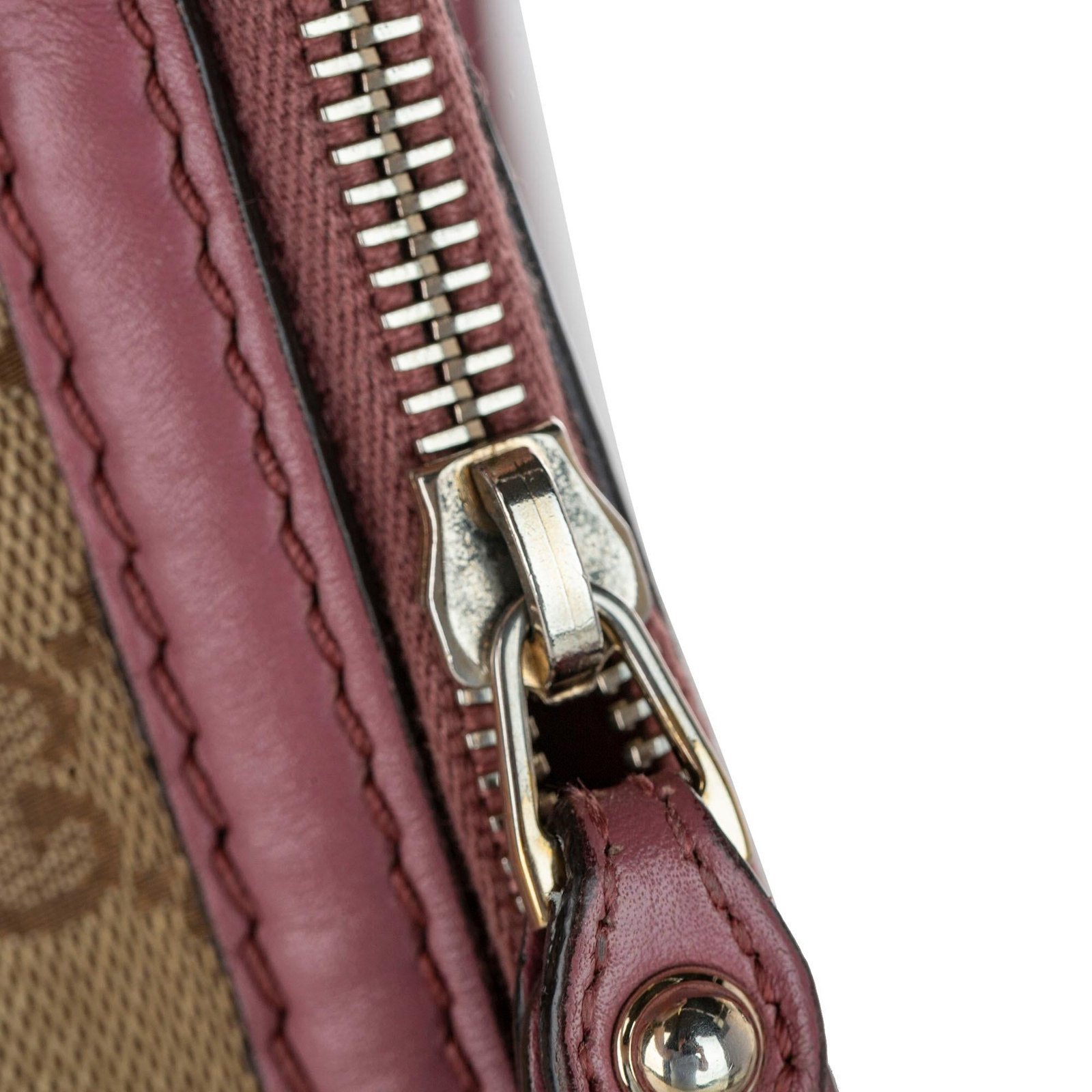 - Signature GG canvas exterior in brown, beige, and pink tones with leather and calfskin accents