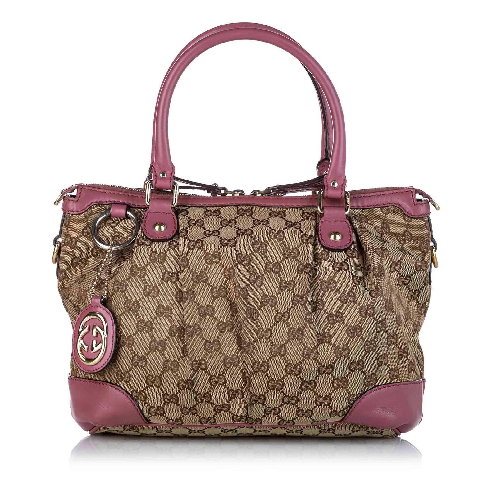 The Gucci GG Canvas Sukey Satchel is a stylish and versatile bag that embodies Gucci’s iconic design and Italian craftsmanship. Crafted from signature GG canvas in elegant brown, beige, and pink tones with leather and calfskin accents, this satchel features rolled leather handles and a flat shoulder strap for comfortable carry. The top zip closure opens to a well organized interior with a zip pocket, combining sophisticated style with practical functionality.