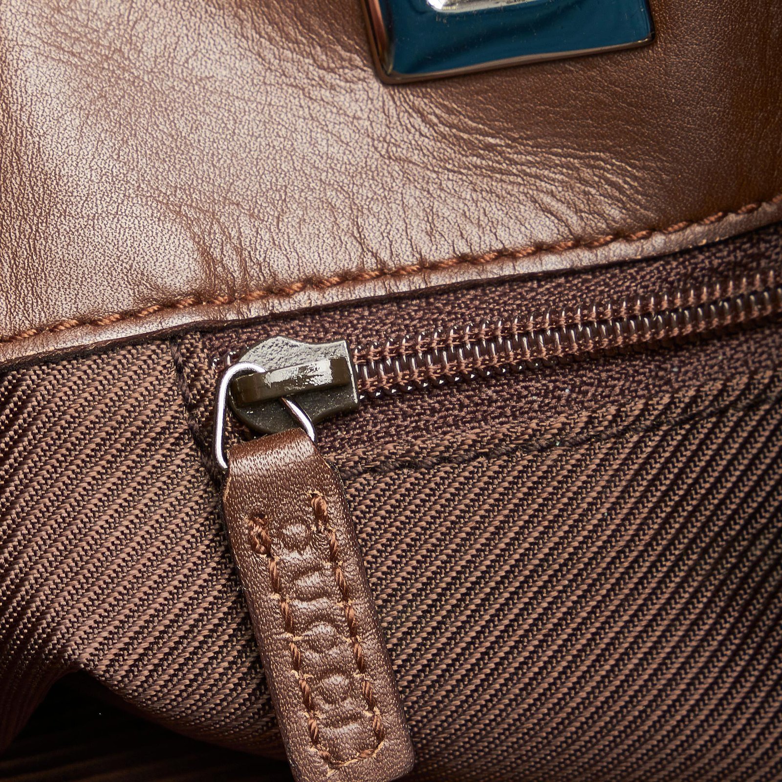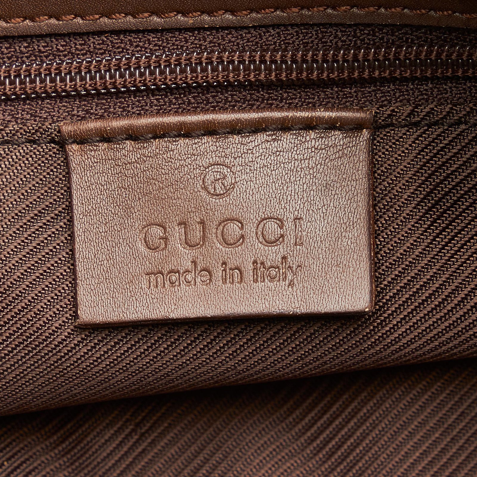 • Signature GG canvas exterior in rich brown tones with leather trim