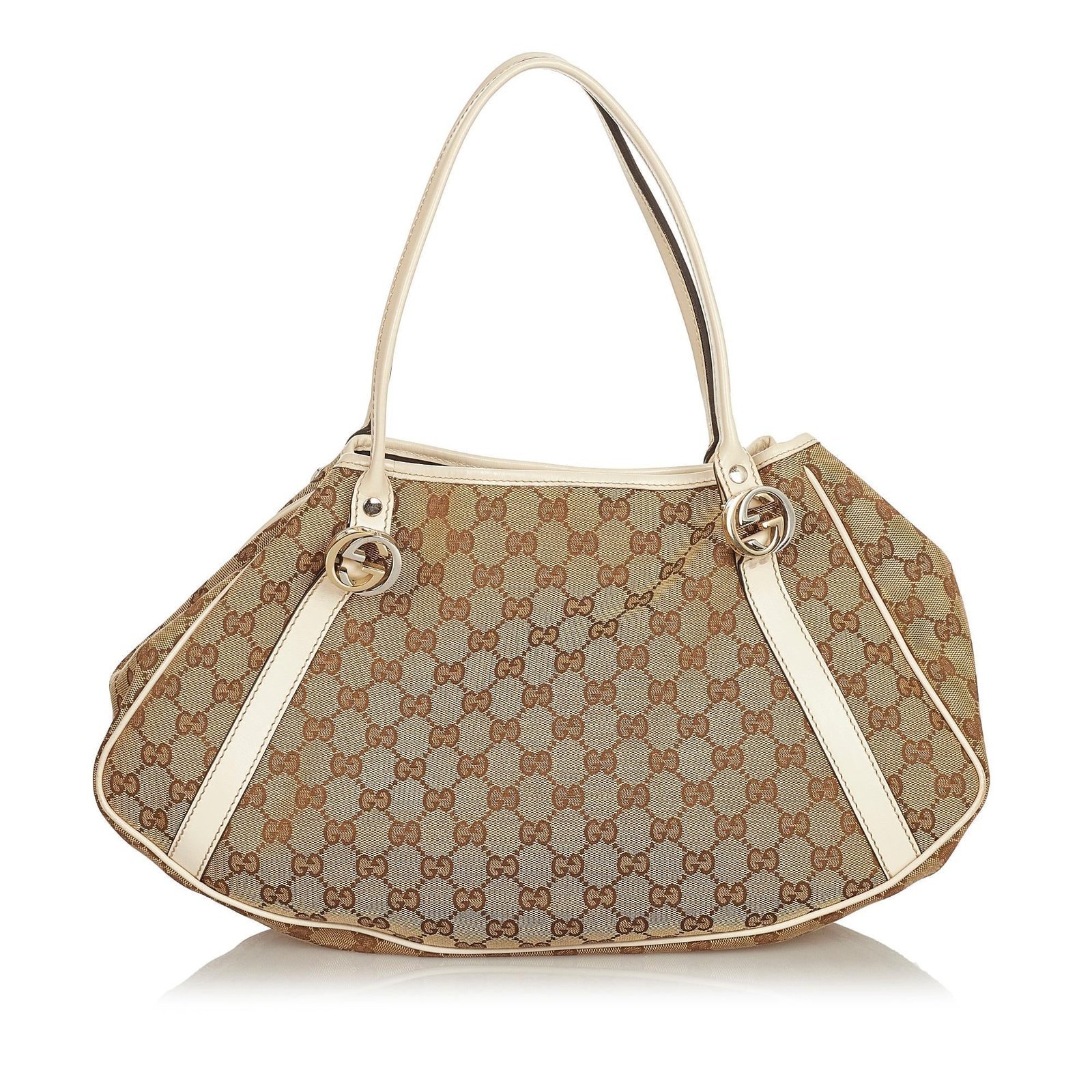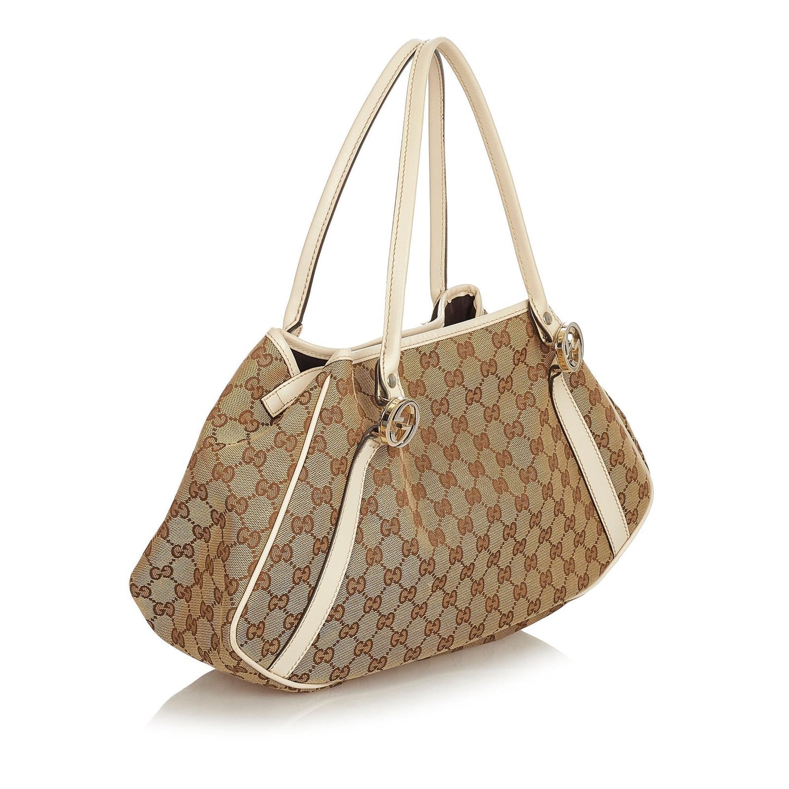 The Gucci GG Canvas Twin Tote Bag is a stylish and versatile accessory that embodies Gucci’s iconic design and Italian craftsmanship. Crafted from signature GG canvas in elegant brown, beige, white, and ivory tones with leather and calfskin accents, this tote features flat leather handles, an open top with magnetic closure, and an interior zip pocket. Its refined yet practical design is perfect for everyday use.