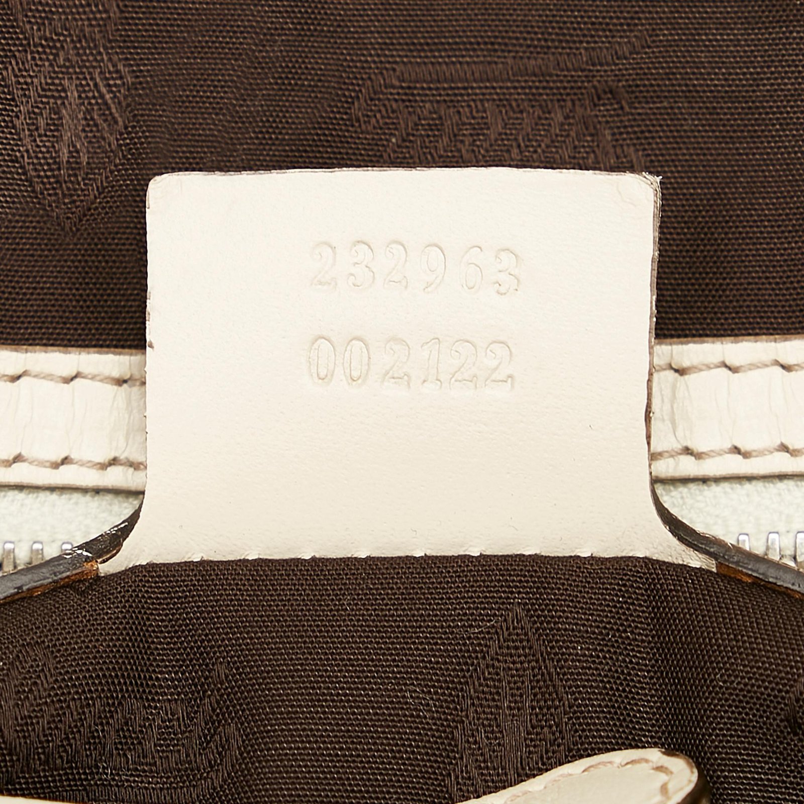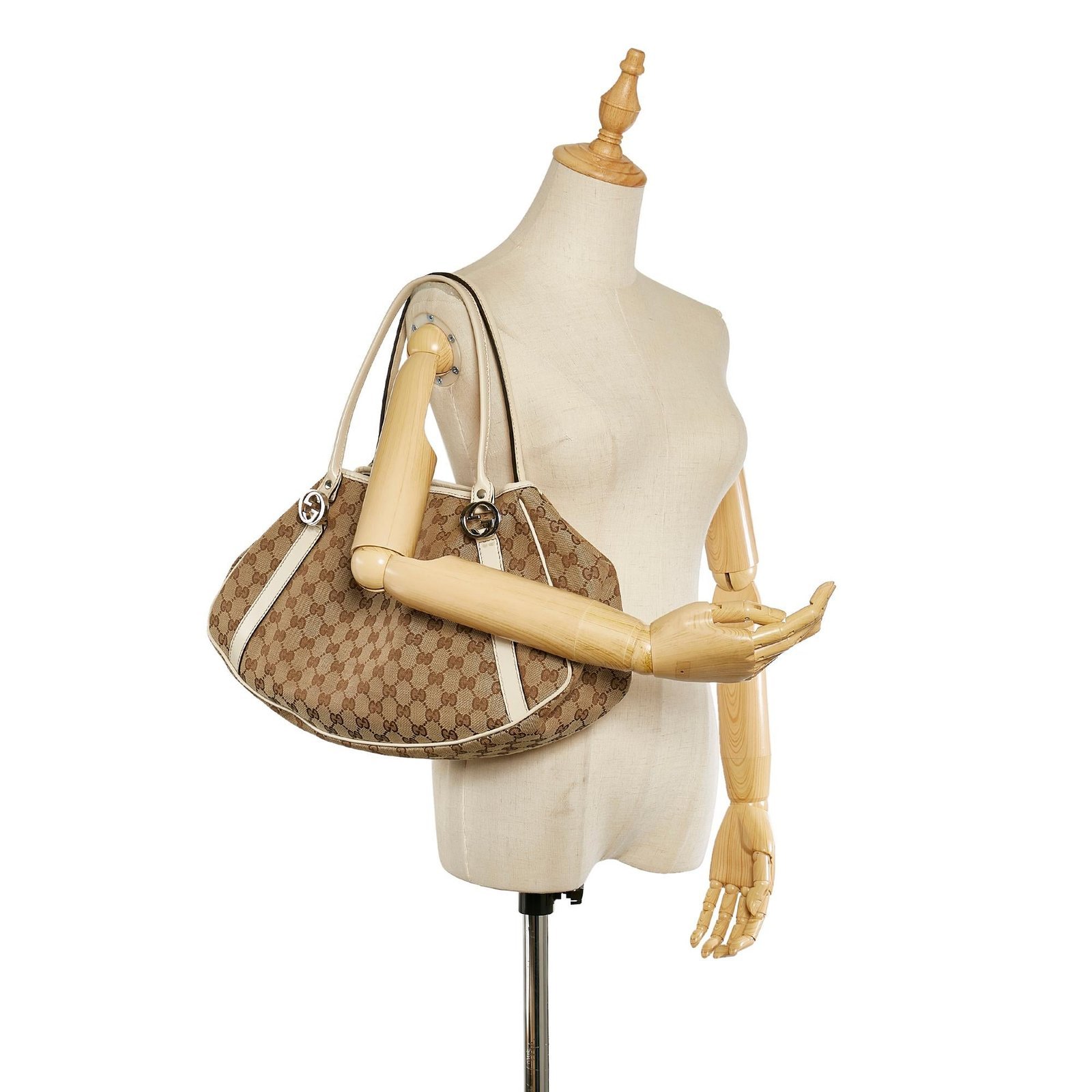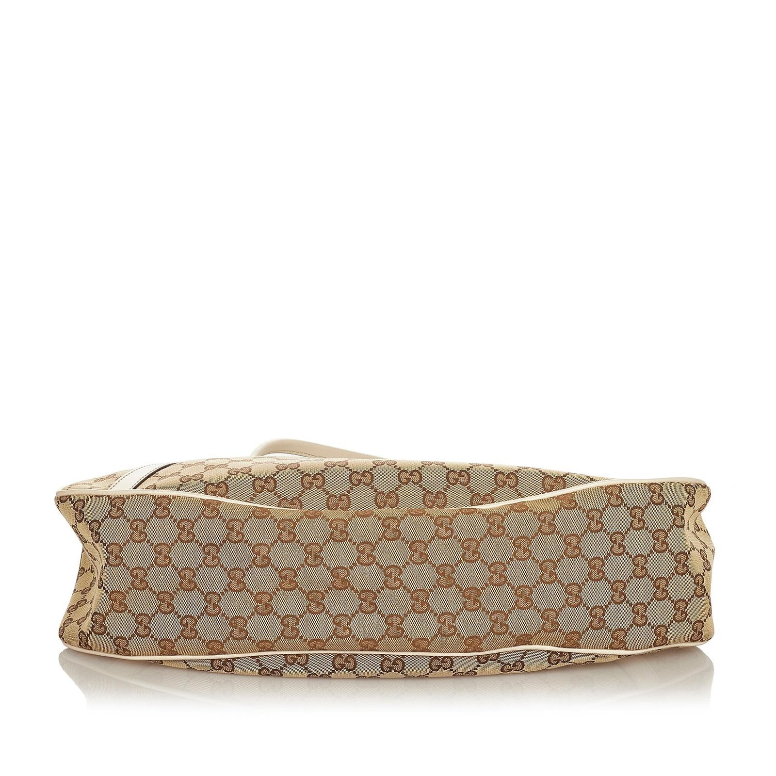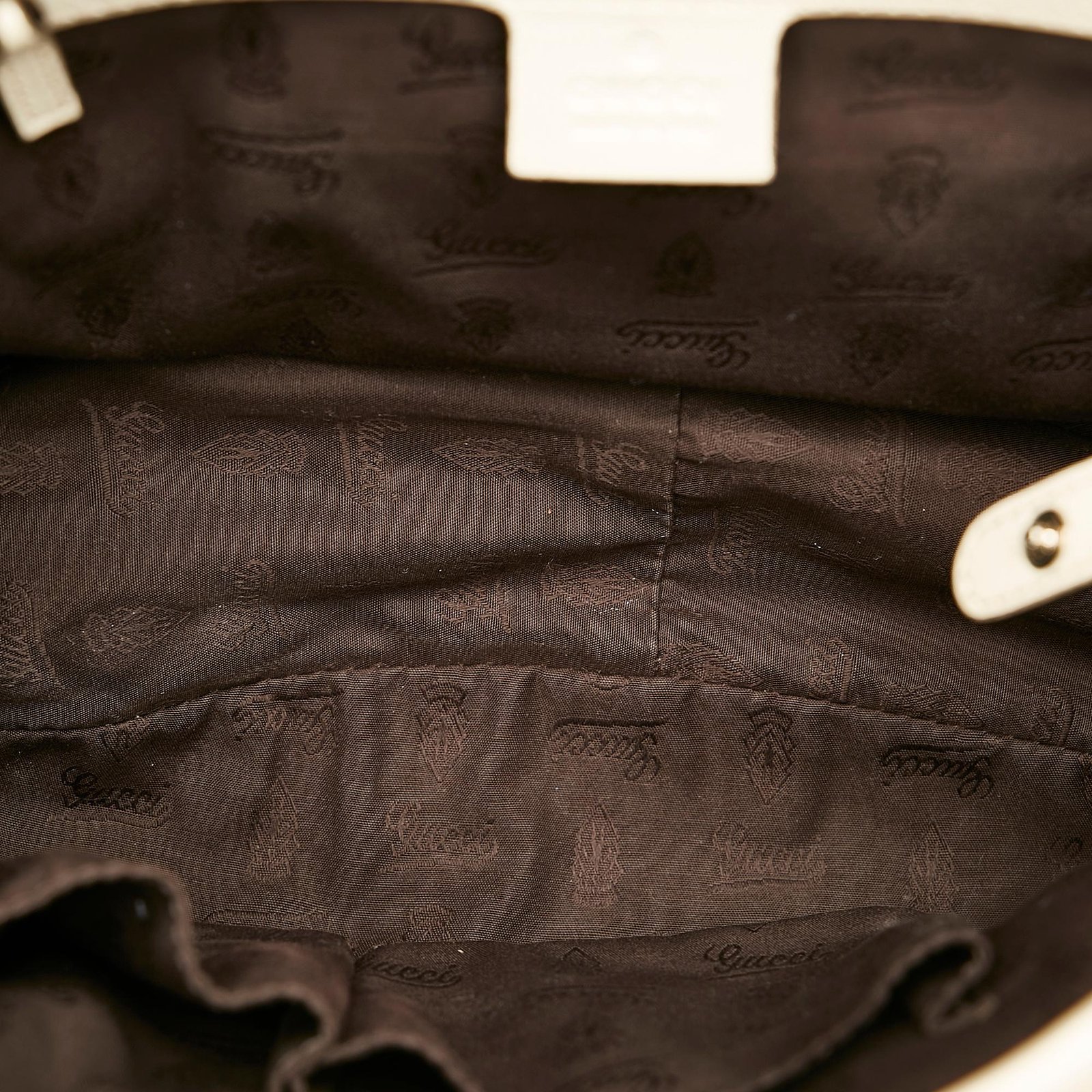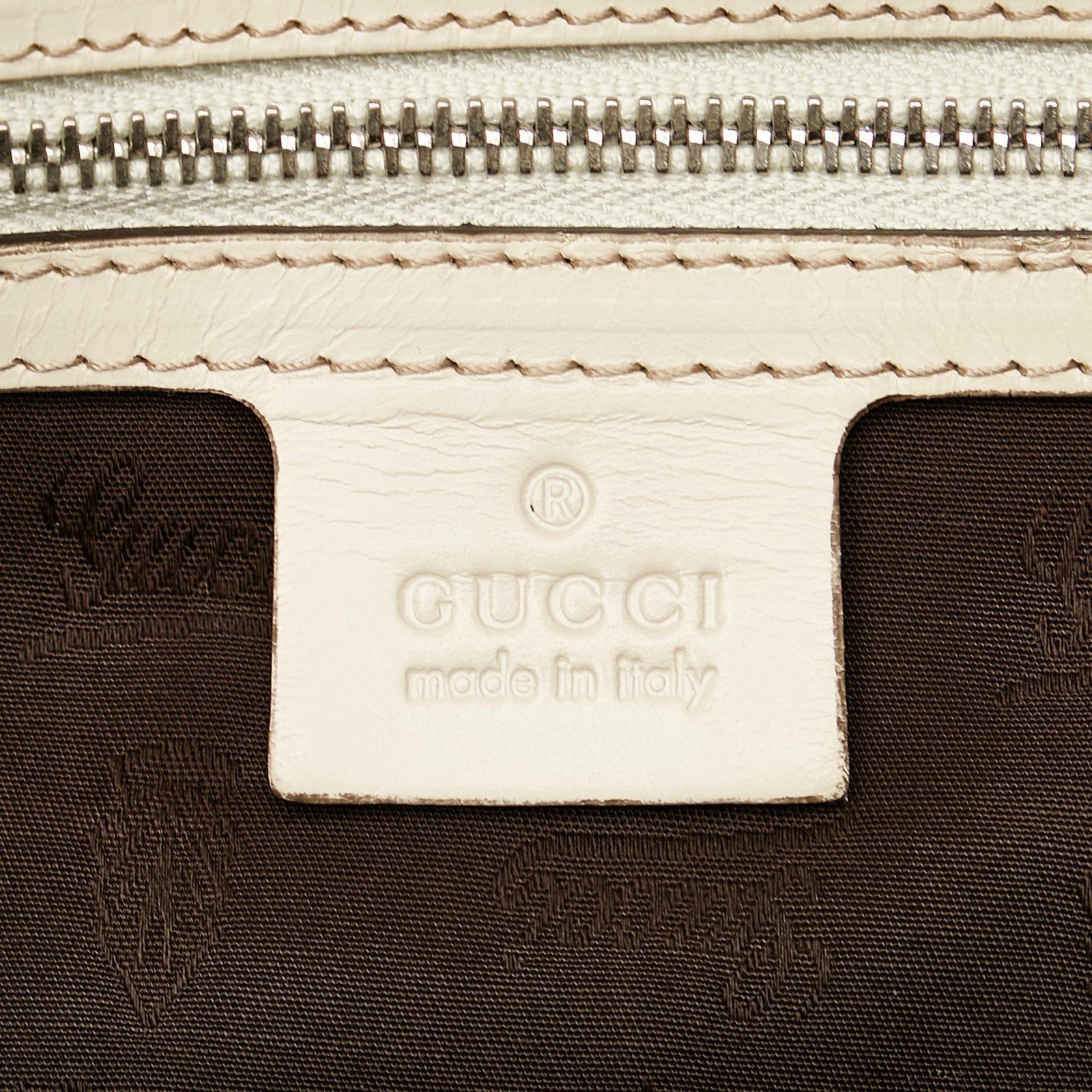 - Signature GG canvas exterior in brown, beige, white, and ivory tones with leather and calfskin accents