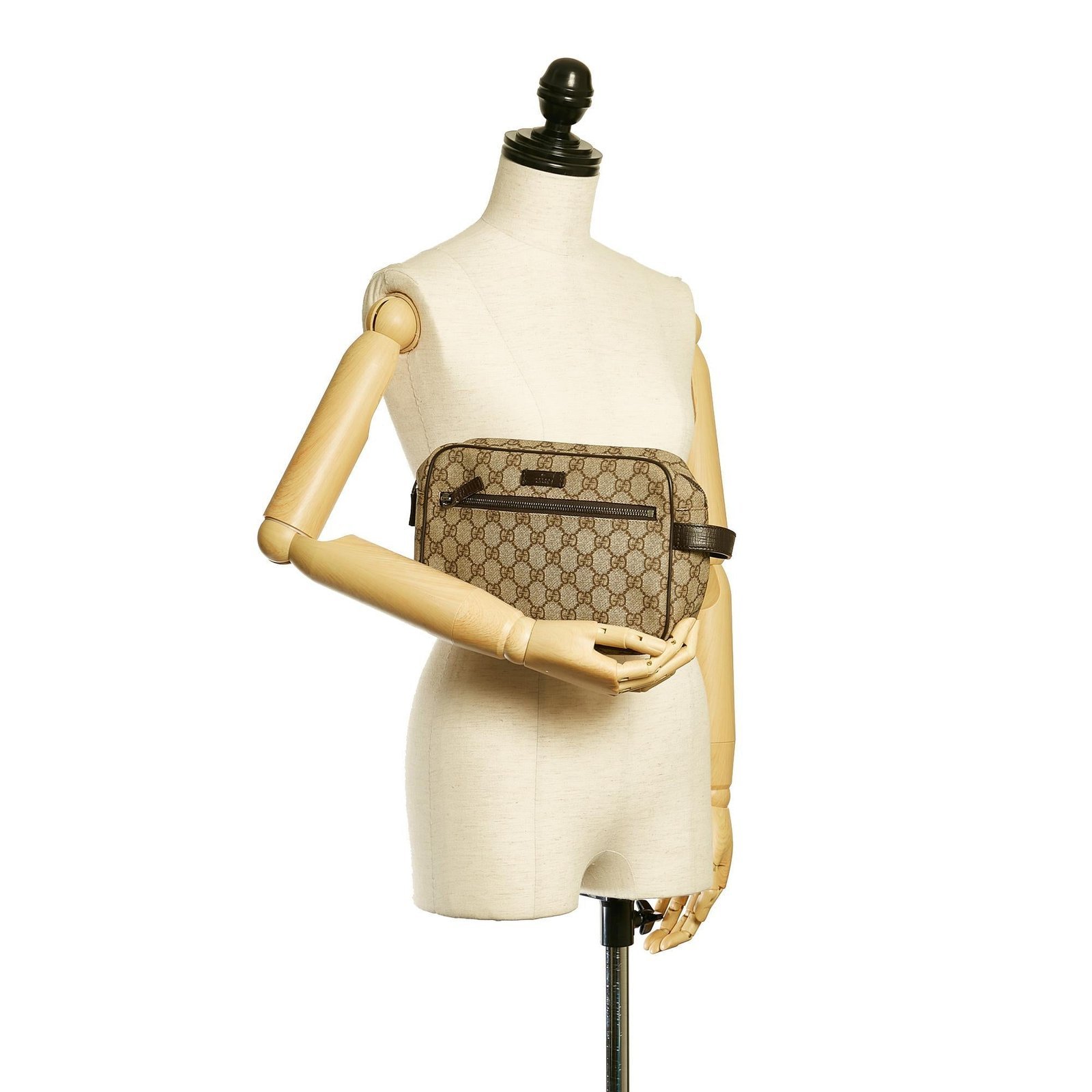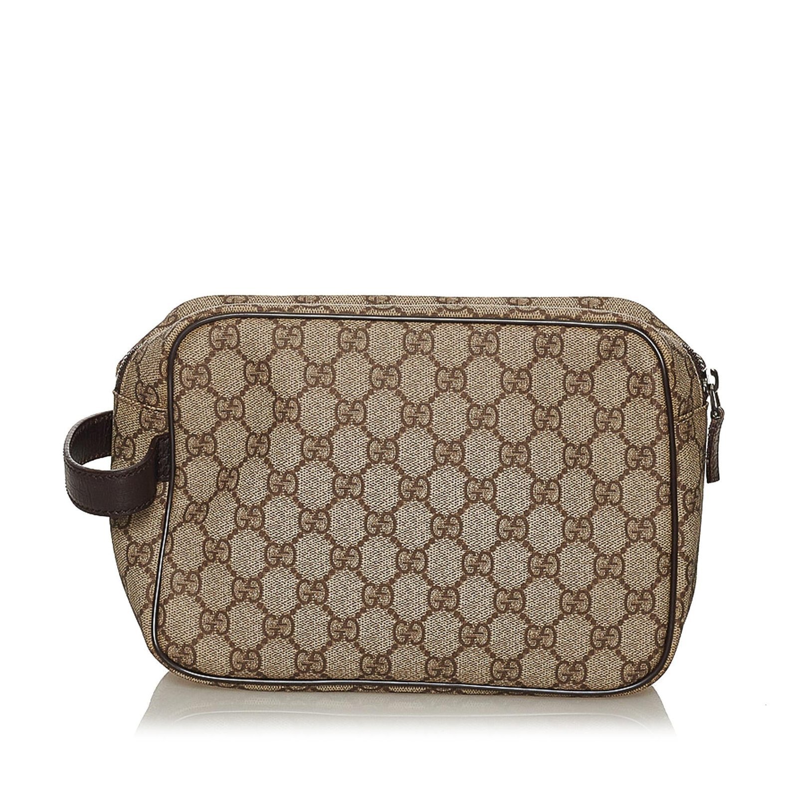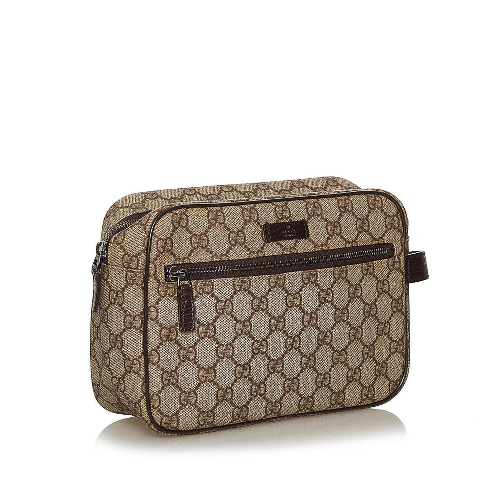 The Gucci GG Supreme Clutch Bag blends Gucci’s signature elegance with functional design. Crafted from coated canvas with leather trim, this clutch features a side flat leather handle, a top zip closure, and an exterior front zip pocket for secure and organized storage. Designed in classic Brown, it offers a polished accessory suitable for both casual and refined occasions. Made in Italy, it reflects the House’s dedication to luxury and timeless craftsmanship.