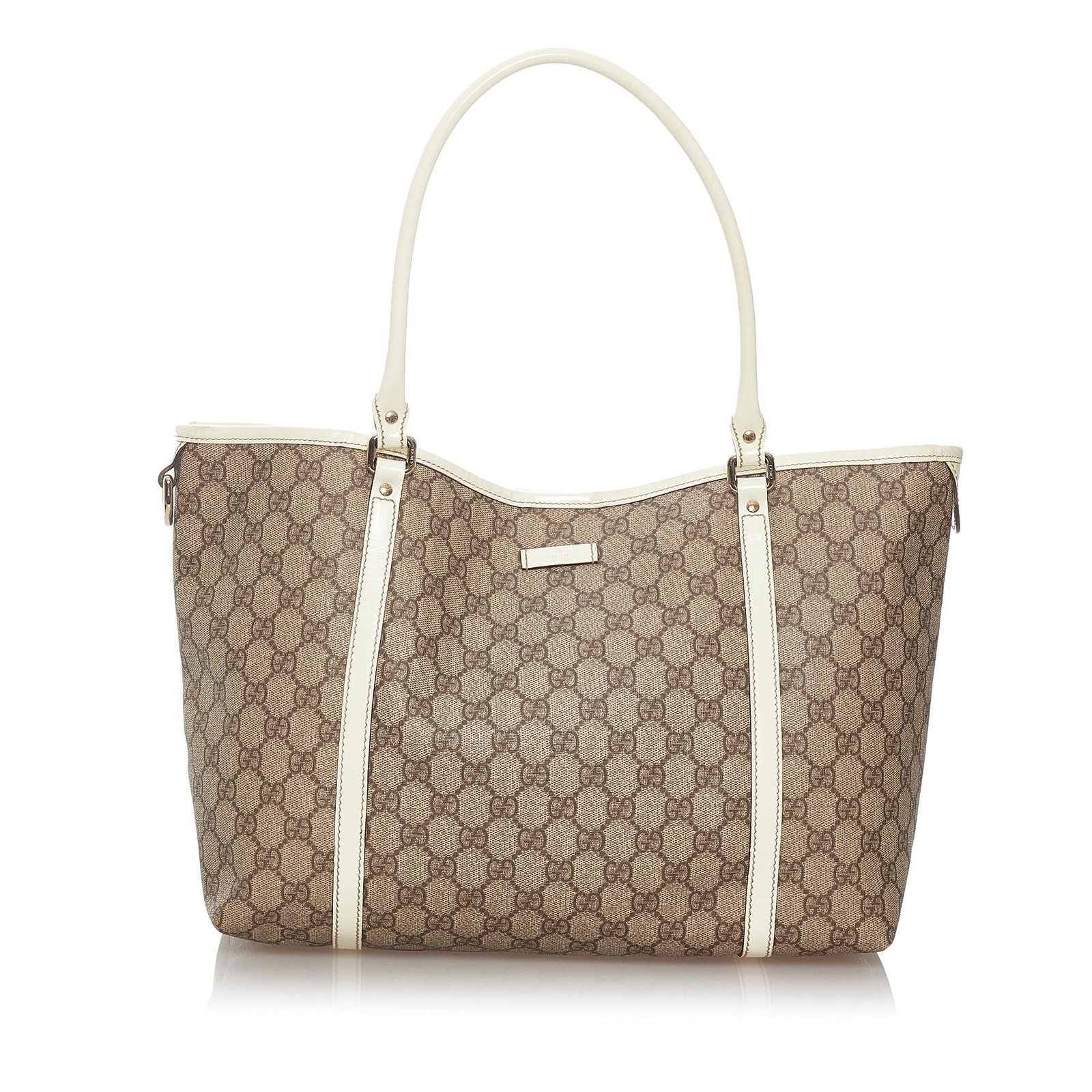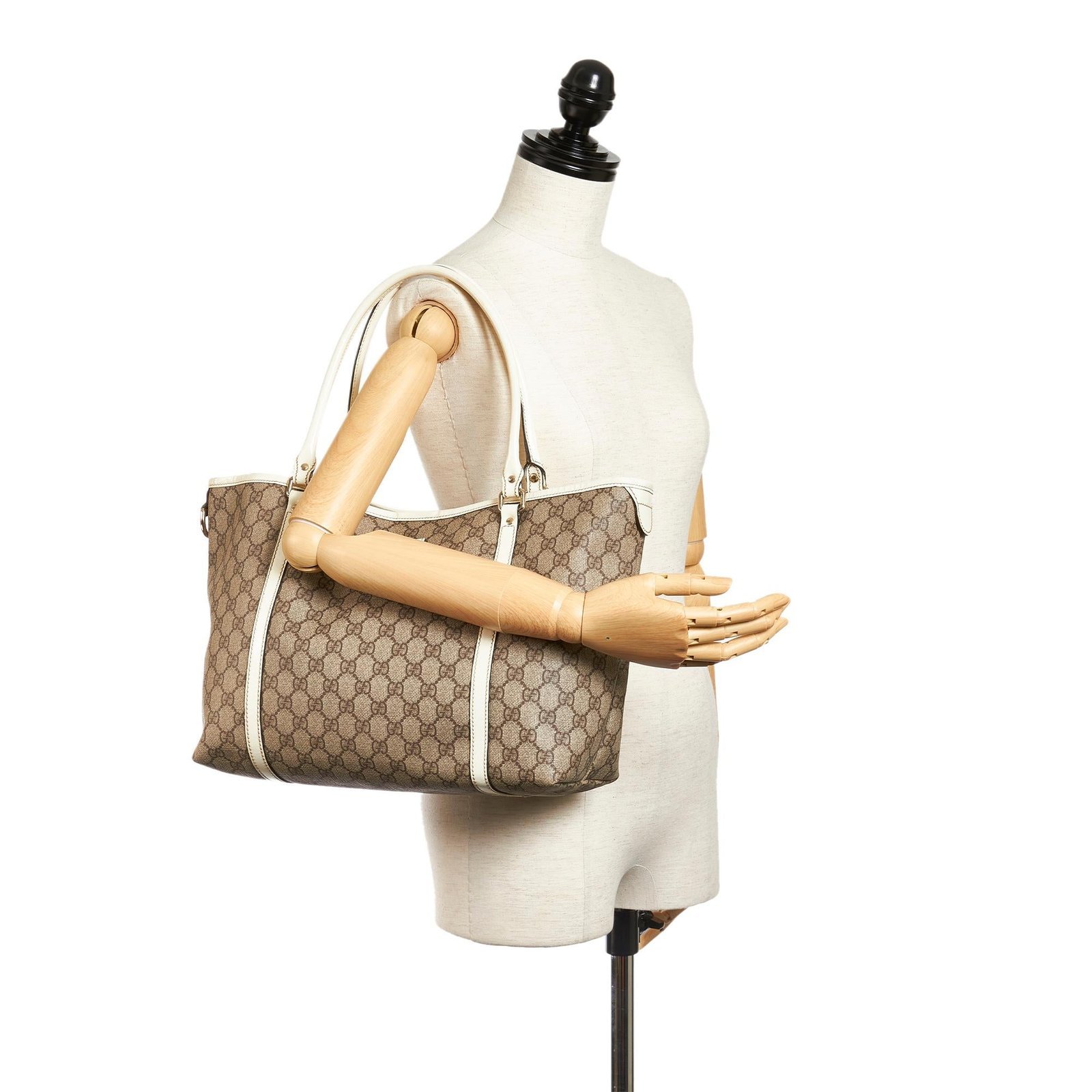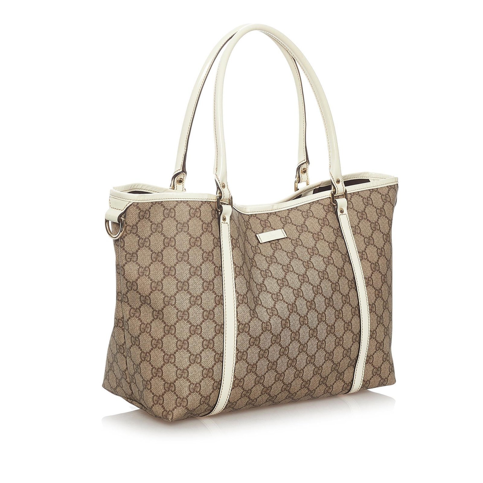 The Gucci GG Supreme Joy Tote Bag is a stylish and versatile accessory crafted from iconic GG Supreme coated canvas with leather trim. It features rolled leather straps, a magnetic snap button closure, and interior zip and slip pockets for effortless organization.