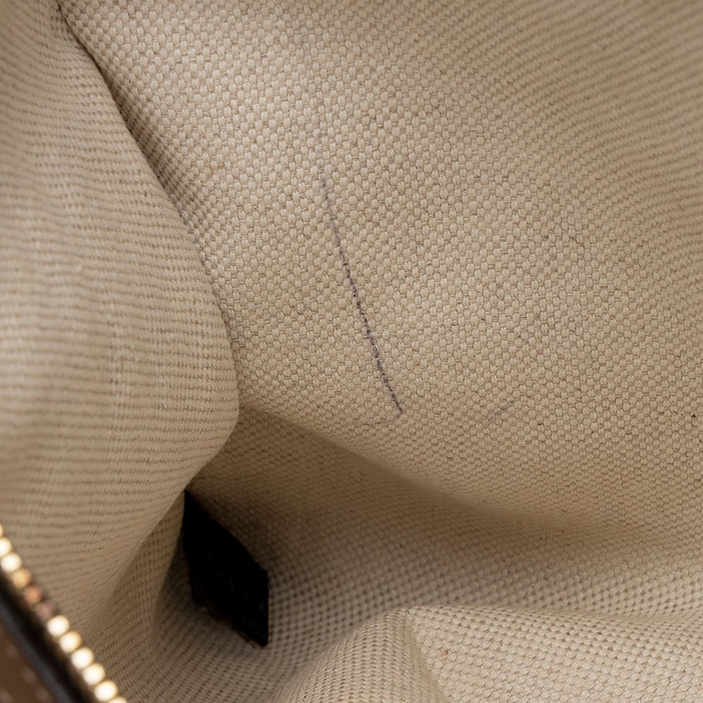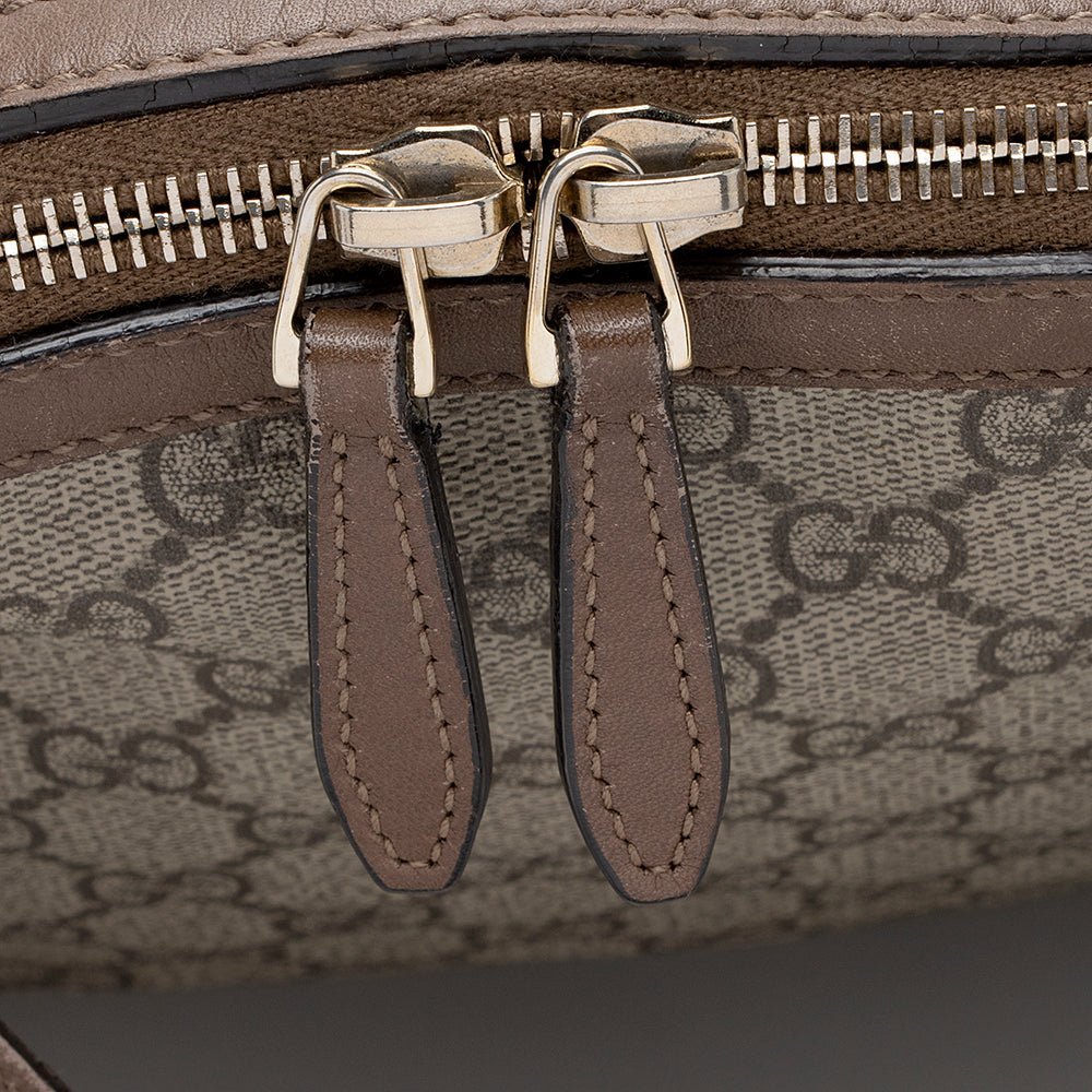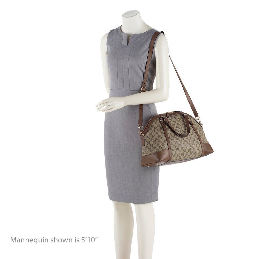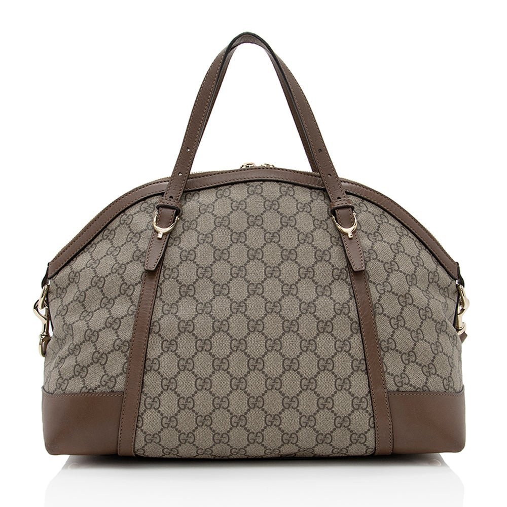 This Gucci GG Supreme Nice Medium Satchel features a brown coated canvas body with leather trim and elegant champagne gold hardware. The satchel includes rolled leather handles and a detachable shoulder strap, offering versatile carrying options.