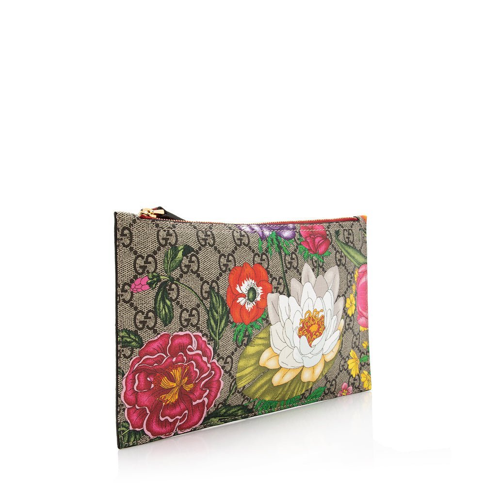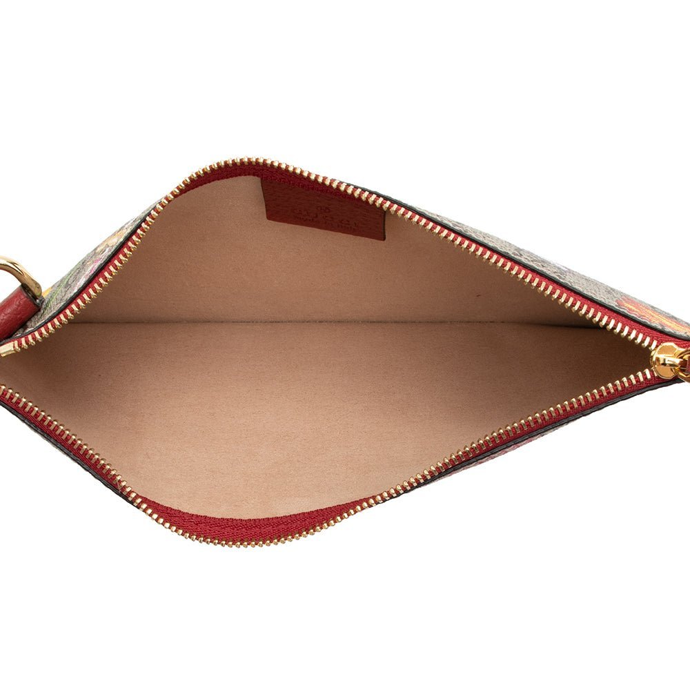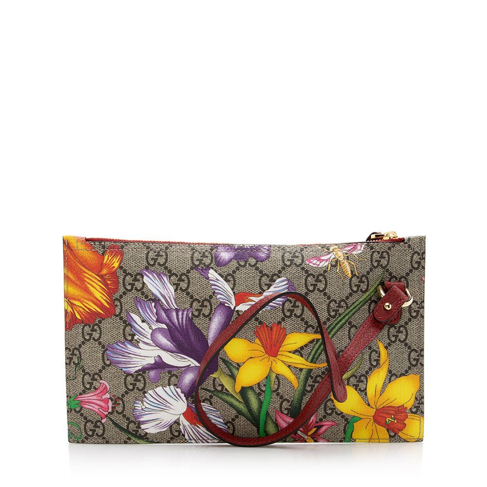 Add a pop of Gucci flair with this Ophidia Flora Pochette, featuring the iconic GG Supreme coated canvas adorned with the vibrant floral motif and leather trim. Gold-tone hardware and a top zip closure complete the elegant design, while a detachable handle offers versatile carry options.