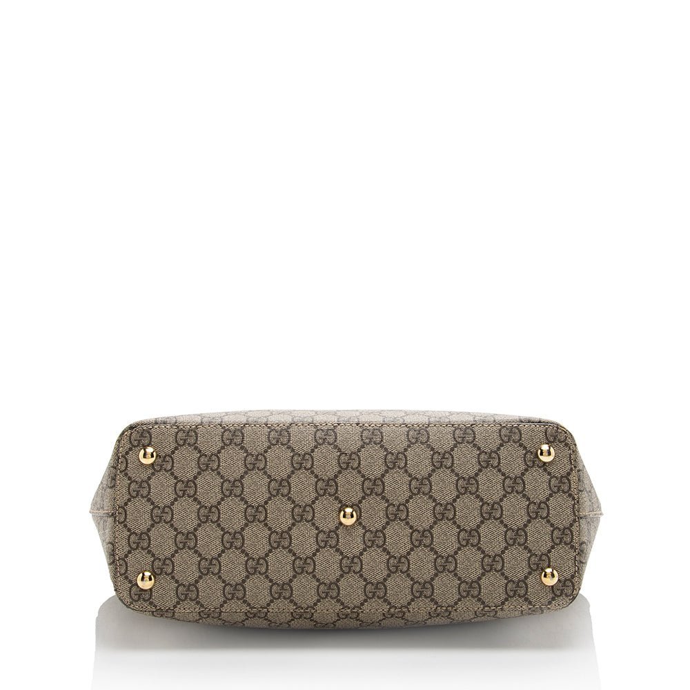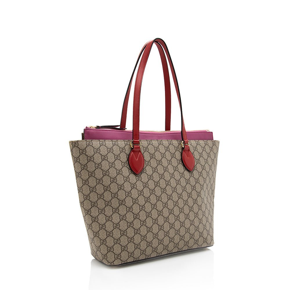 The Gucci GG Supreme Zip Tote is a chic and versatile accessory that combines iconic design with everyday practicality. Crafted from Gucci’s signature GG Supreme coated canvas, this tote features a playful and stylish color palette of khaki, pink, and red, making it a standout addition to any wardrobe.
