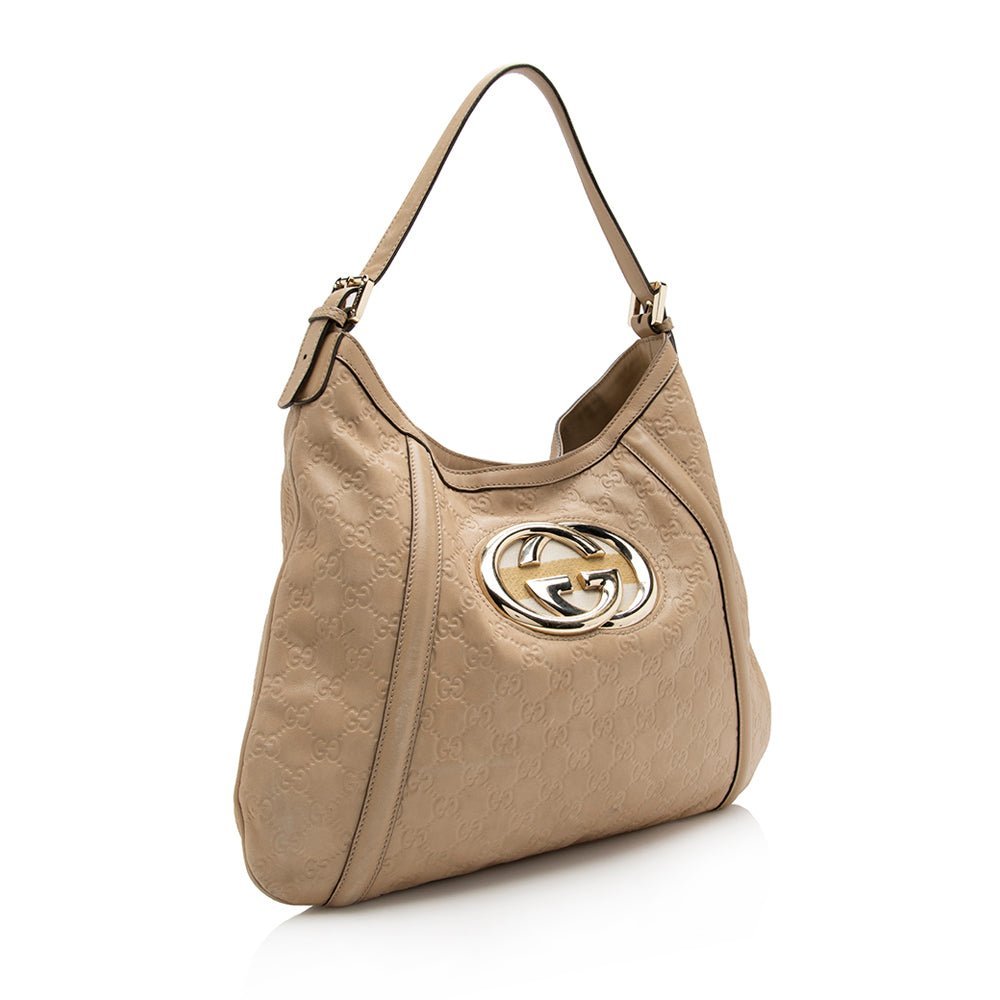 The Gucci Guccissima Leather Britt Medium Hobo is a refined shoulder bag that blends iconic design with everyday practicality. Crafted in Italy from luxurious leather with subtle GG detailing, this hobo-style bag showcases a soft, elegant silhouette in a versatile beige tone that pairs effortlessly with both casual and polished looks.