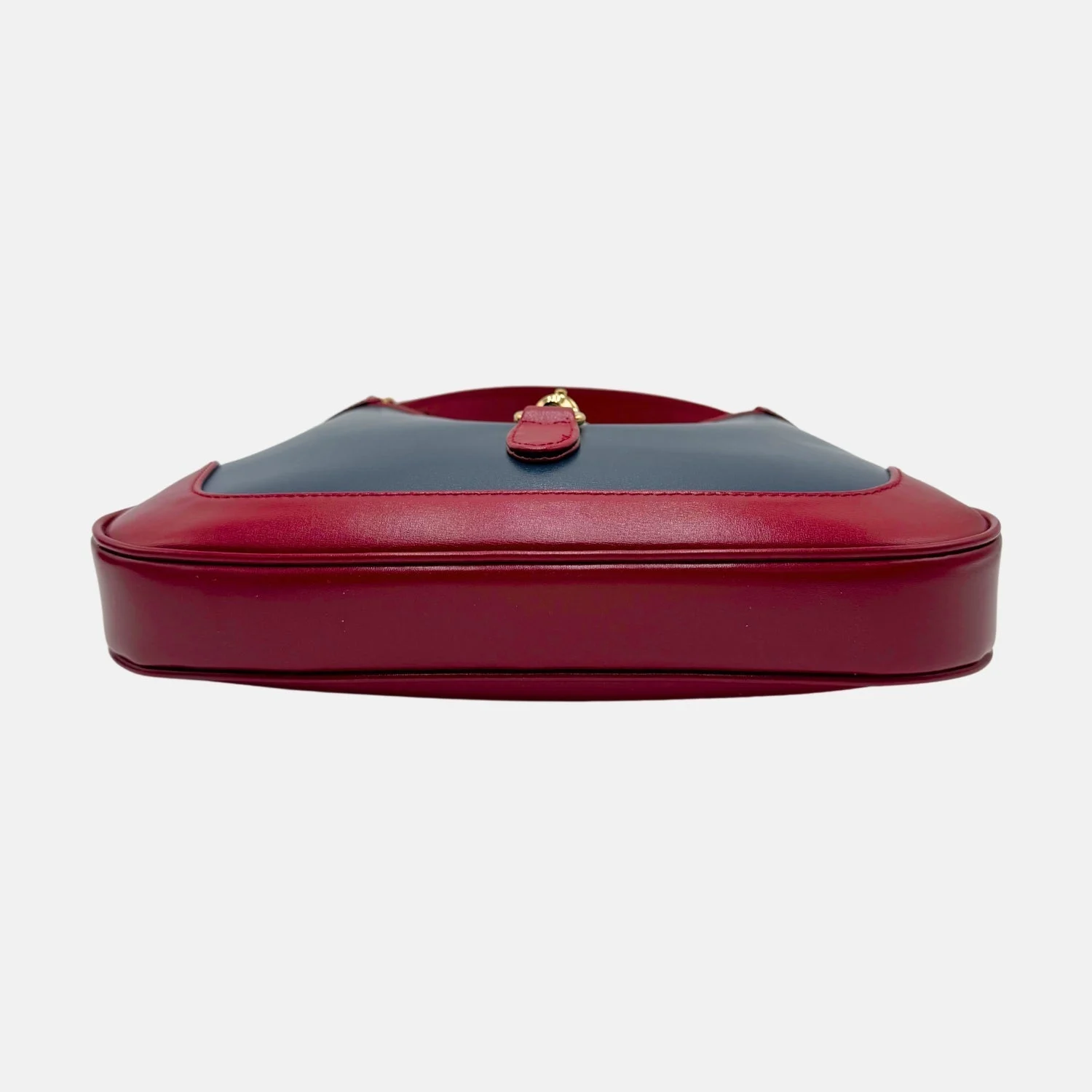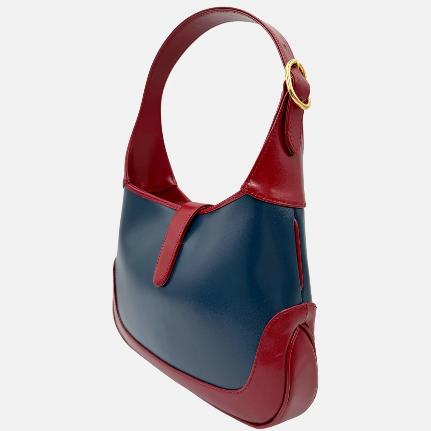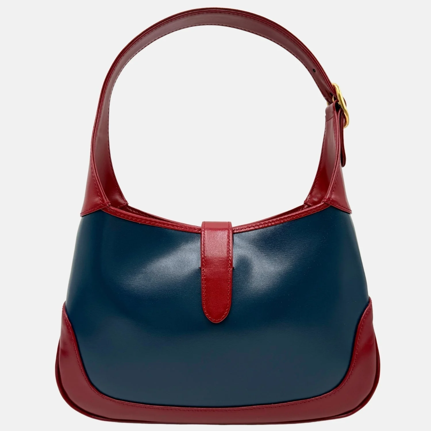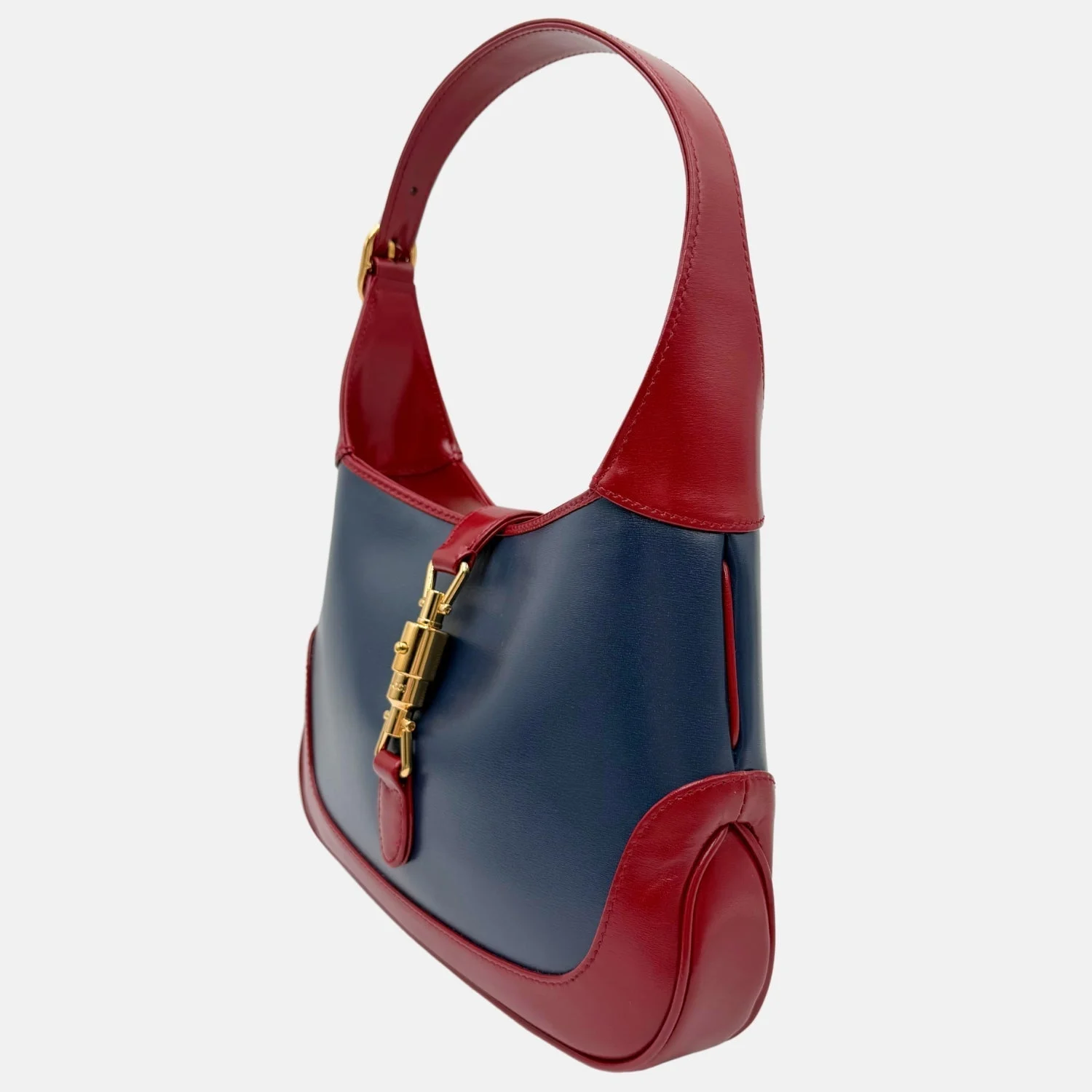 This is an authentic small Gucci Jackie 1961 Hobo in Blue Agata and Cherry Red Lux Calfskin. Crafted from premium boarded Lux calfskin, this elegant bag features a striking bi-color design in deep blue and rich red. The iconic curved silhouette is complemented by a sleek leather shoulder strap and a signature light gold piston lock closure. The interior, lined in soft fabric, offers a well-organized space with both a zipper pocket and a patch pocket for essentials. A timeless blend of heritage and modern sophistication, this piece is a standout addition to any collection.