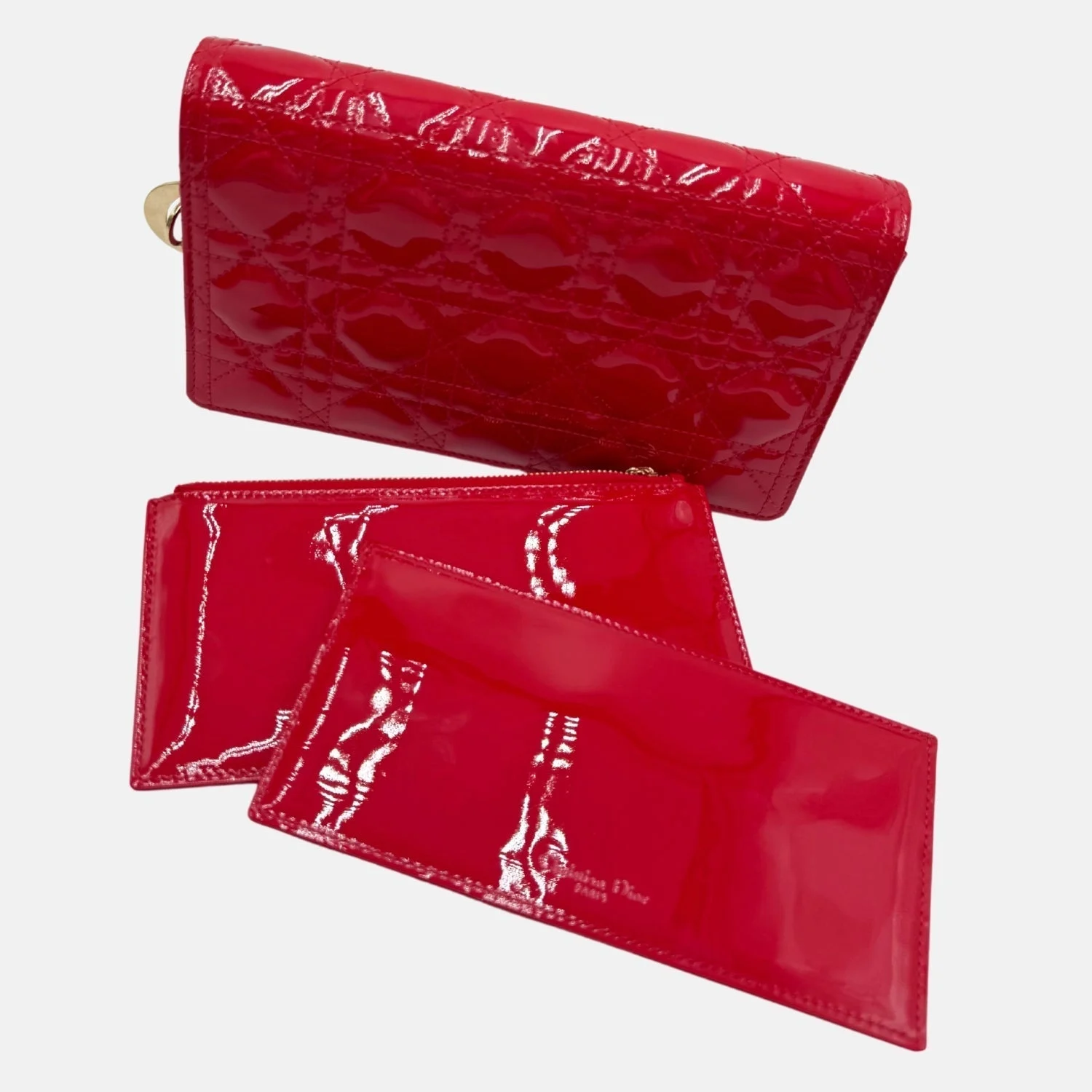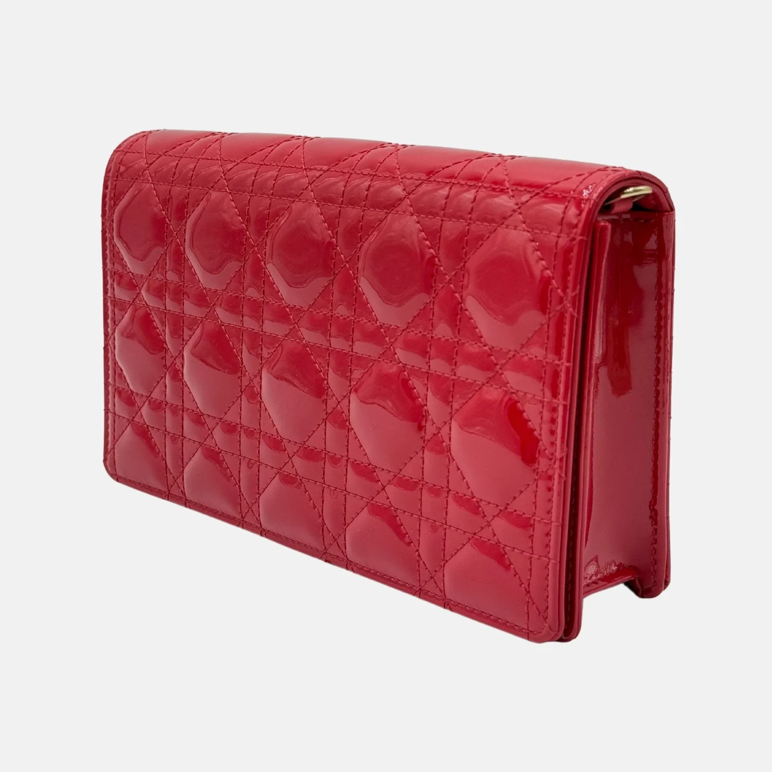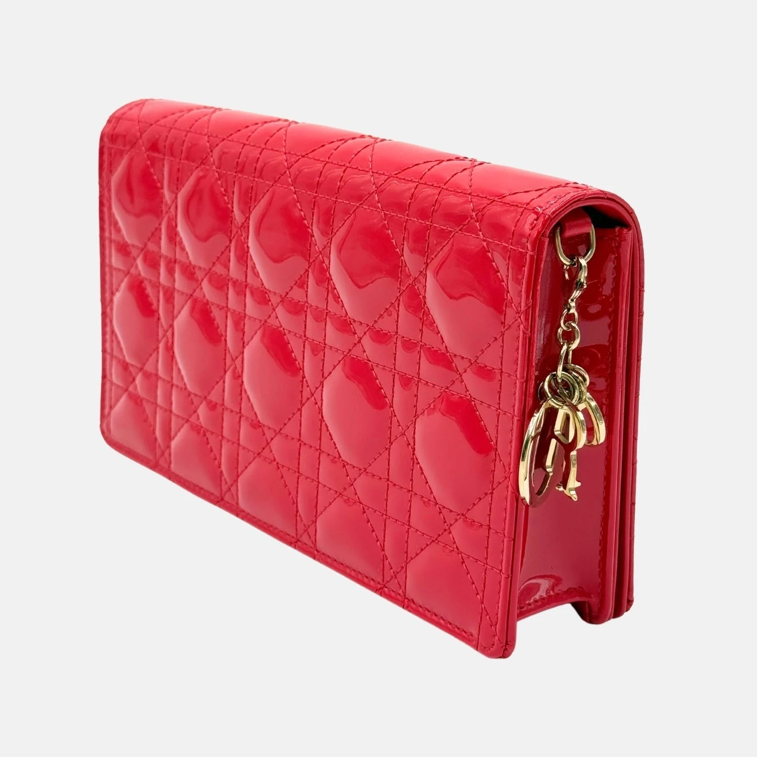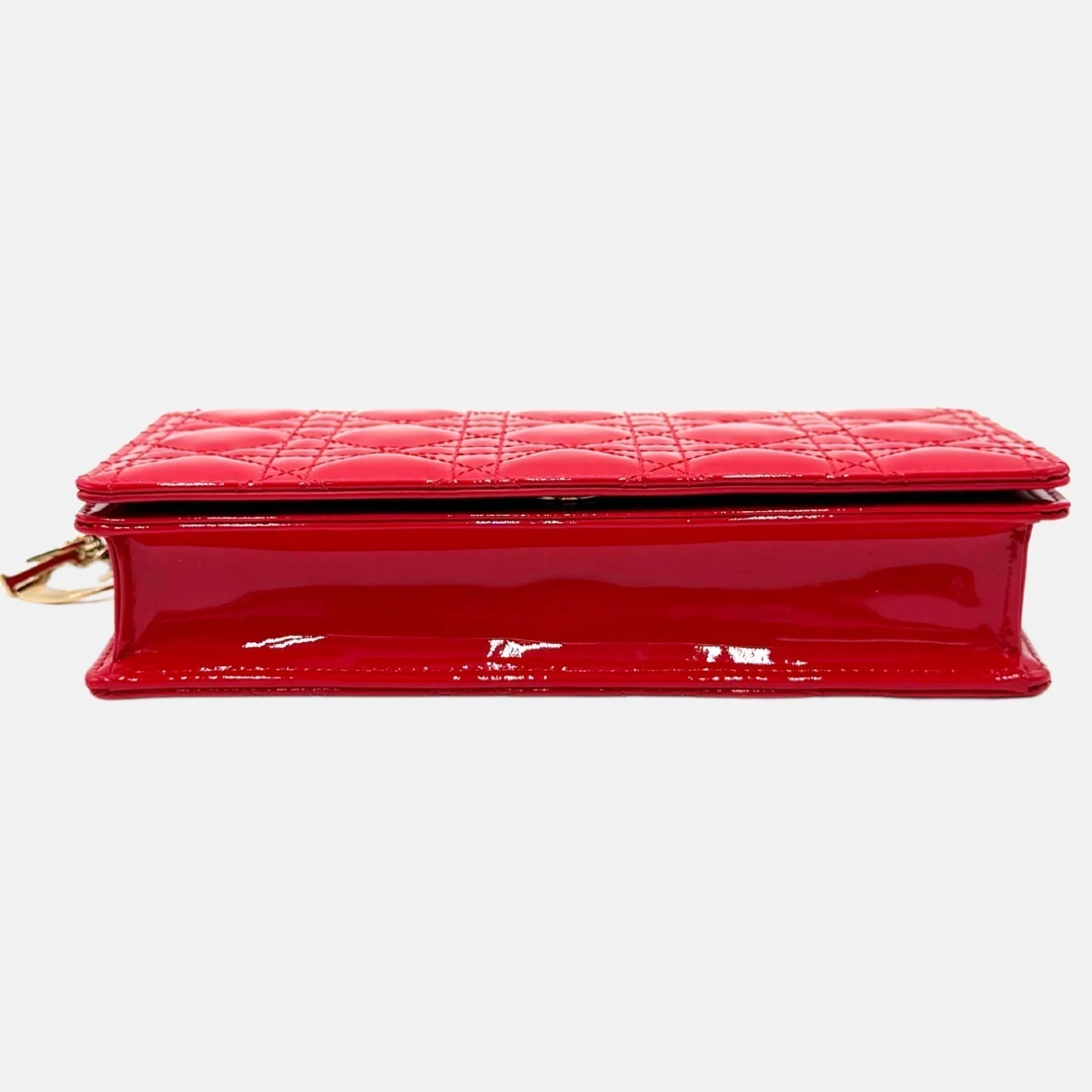 The Lady Dior Clutch Bag in red patent leather is a timeless and elegant accessory. Crafted with Dior’s signature cannage quilted design, it features light gold-tone hardware and the iconic Dior letter charms on the side. The interior offers a slim compartment with a pocket, perfectly sized for your phone and small essentials. It can be worn as a crossbody with the removable chain strap or carried as a classic pouch. This piece is both versatile and sophisticated, ideal for day or evening wear.