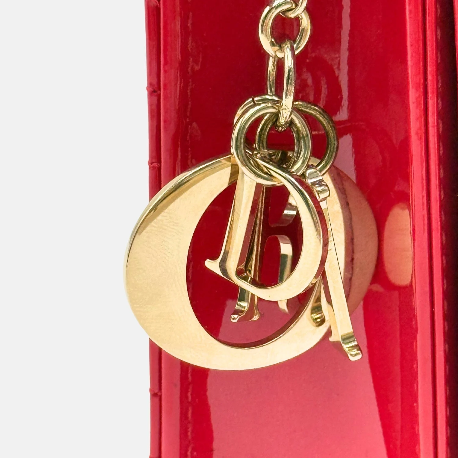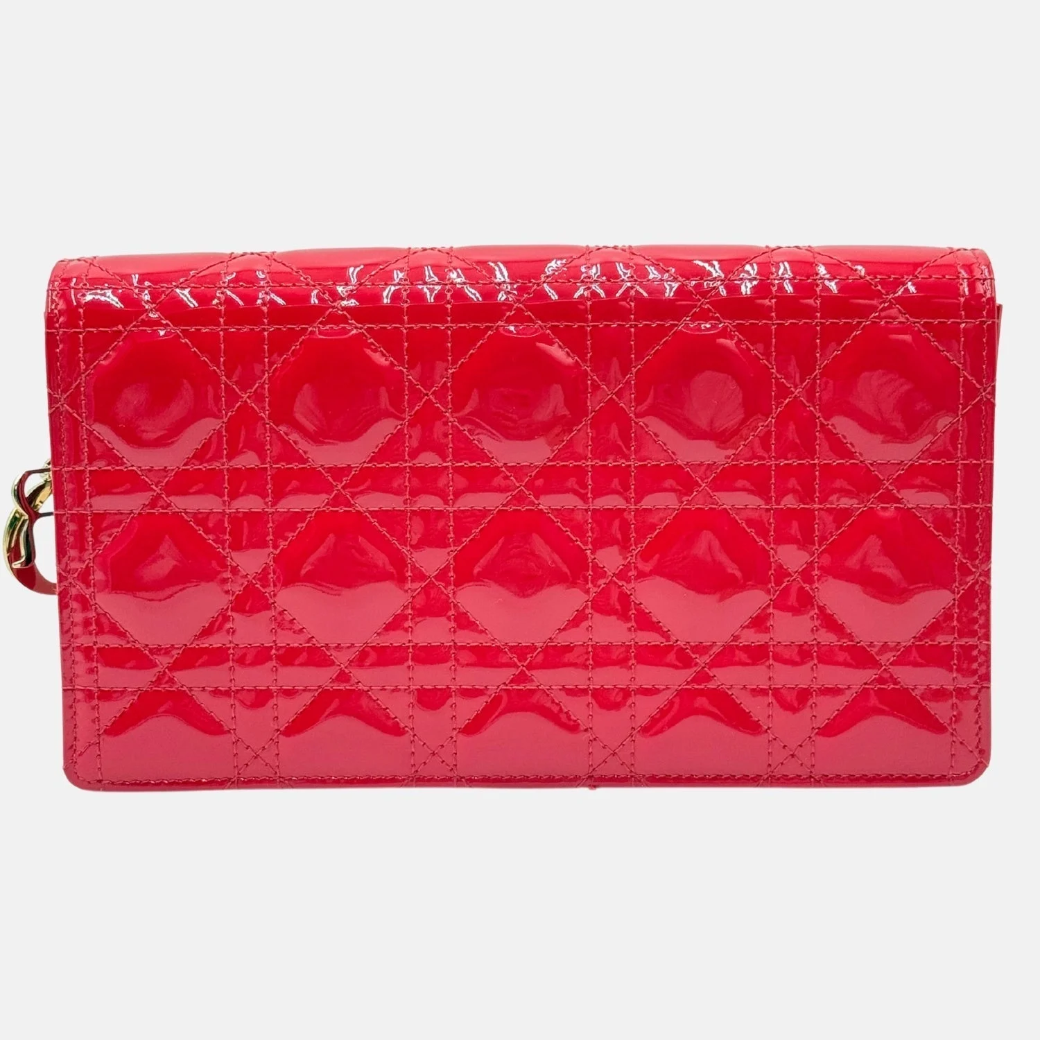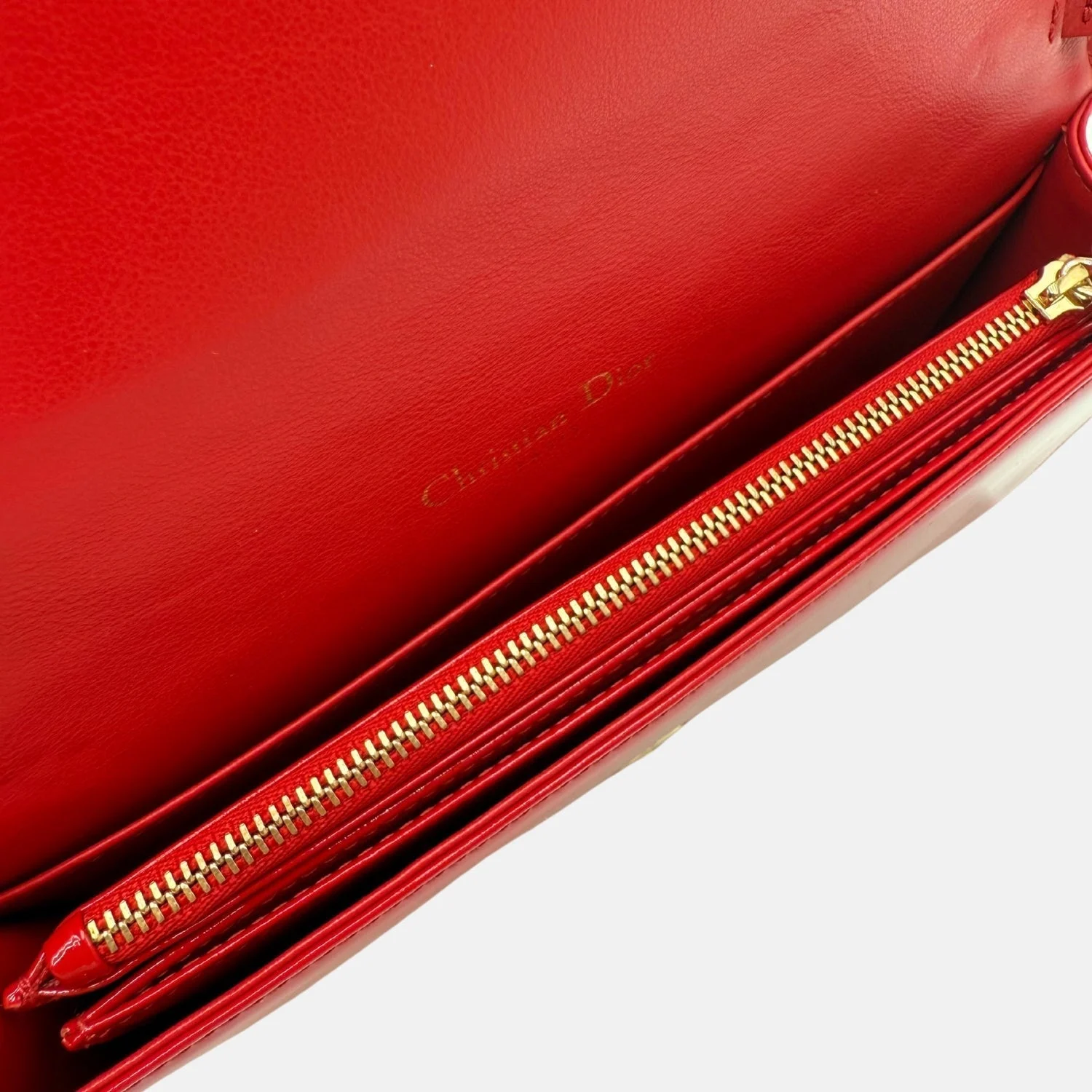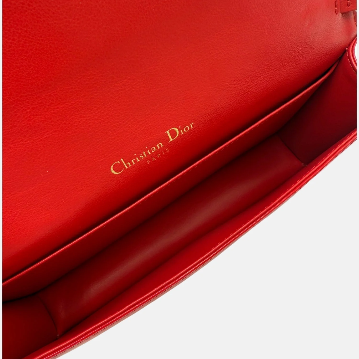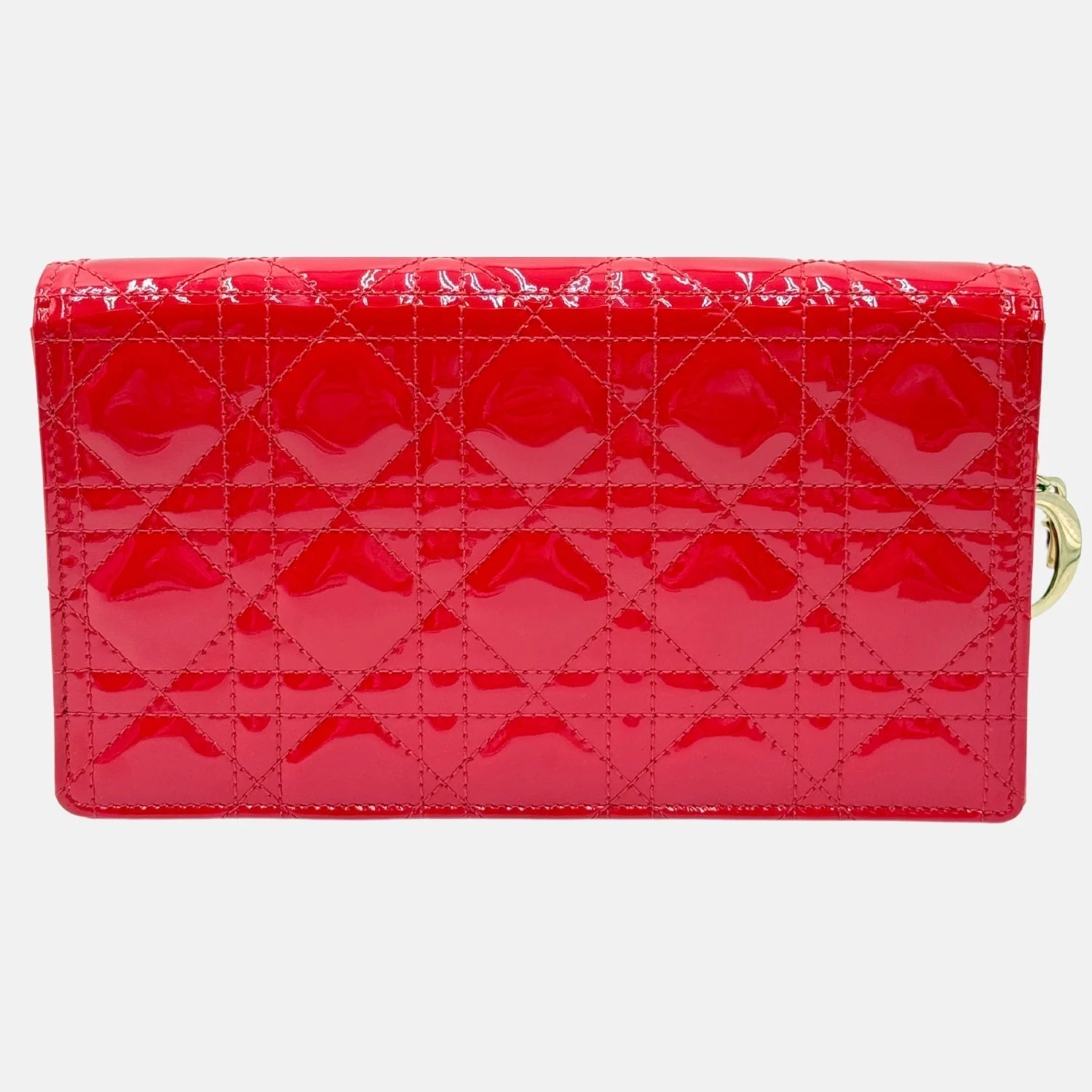 The Lady Dior Clutch Bag in red patent leather is a timeless and elegant accessory. Crafted with Dior’s signature cannage quilted design, it features light gold-tone hardware and the iconic Dior letter charms on the side. The interior offers a slim compartment with a pocket, perfectly sized for your phone and small essentials. It can be worn as a crossbody with the removable chain strap or carried as a classic pouch. This piece is both versatile and sophisticated, ideal for day or evening wear.