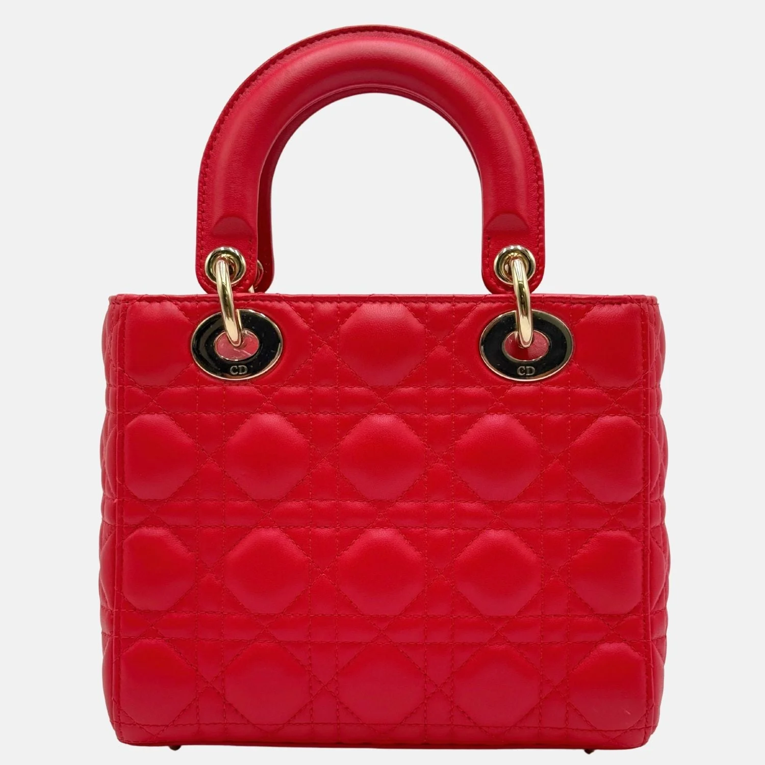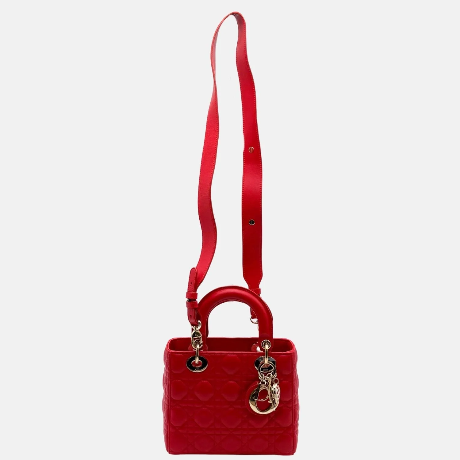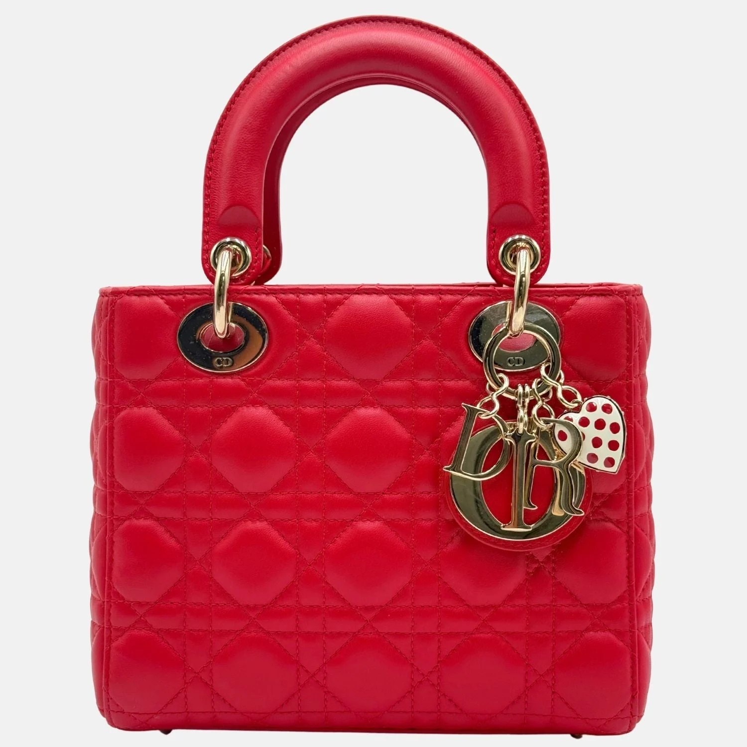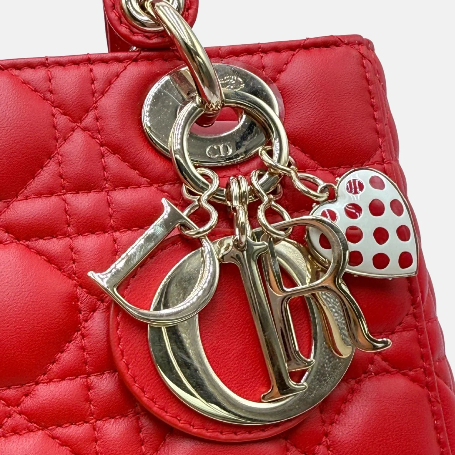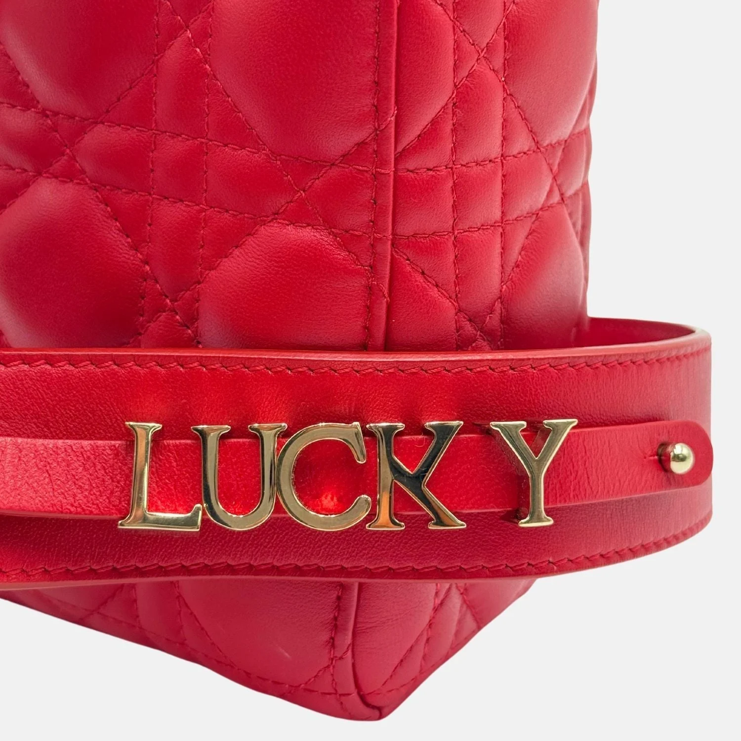 The Lady Dior My ABCDior Red Lambskin Cannage Small is crafted from luxurious red lambskin leather with signature cannage quilting. This elegant tote features rolled and reinforced leather handles, along with a chic shoulder strap that spells “LUCKY” in gold lettering. The front of the bag is adorned with charming heart and Dior charms, adding a playful yet sophisticated touch. The top inner flap opens to a matching red suede interior with a zip pocket and a patch pocket, combining timeless elegance with functional design.