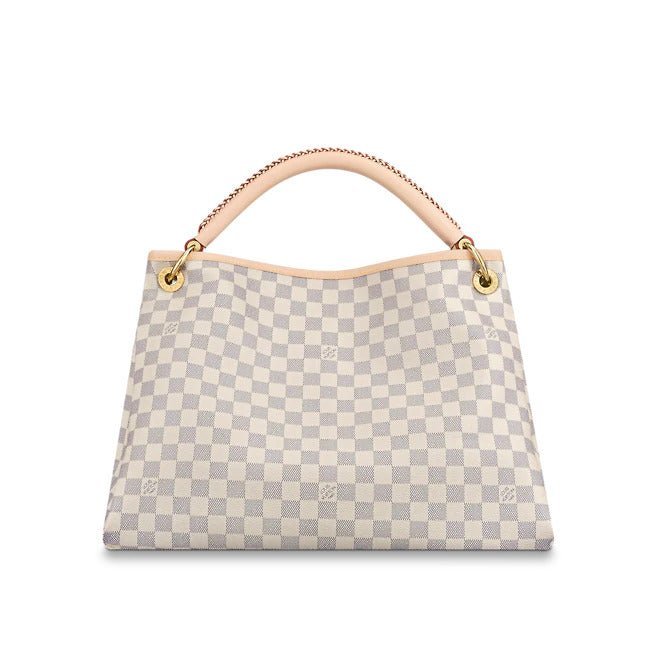 The Artsy MM looks fresh and feminine in supple Damier Azur canvas. Adorned with shiny golden brass and a chic bag charm, its exquisite handcrafted leather handle adds a luxurious crowning touch.