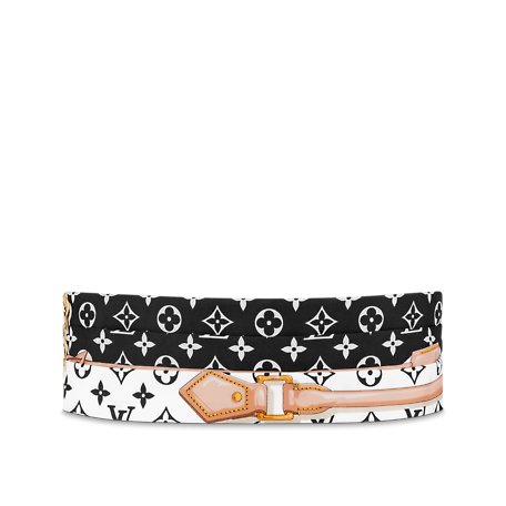 This LV Silk 30mm belt blurs the boundaries between the House’s Leather Goods and Textiles Collections. It is inspired by the much-loved Monogram Confidential square and showcases an intricate Monogram print interwoven with chains, straps and padlocks. The belt’s combination of silk and natural cowhide lends it textural appeal, while the gleaming LV buckle ensures an elegant finish.