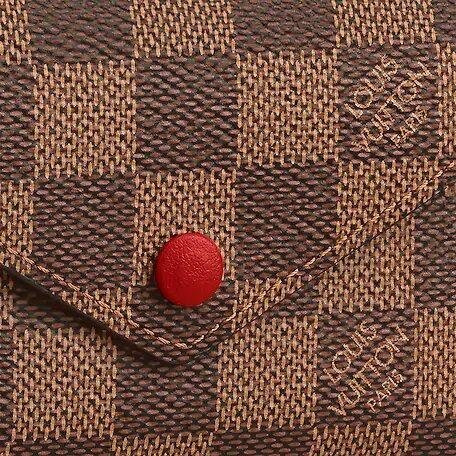 The Victorine wallet in Damier Ebene canvas is a compact, envelope-fashion design which opens out to show various practical features, such as space for bills and cards, and a zipped coin pocket on the side. Its colorful press-stud and grained-leather lining upload a touch of femininity.