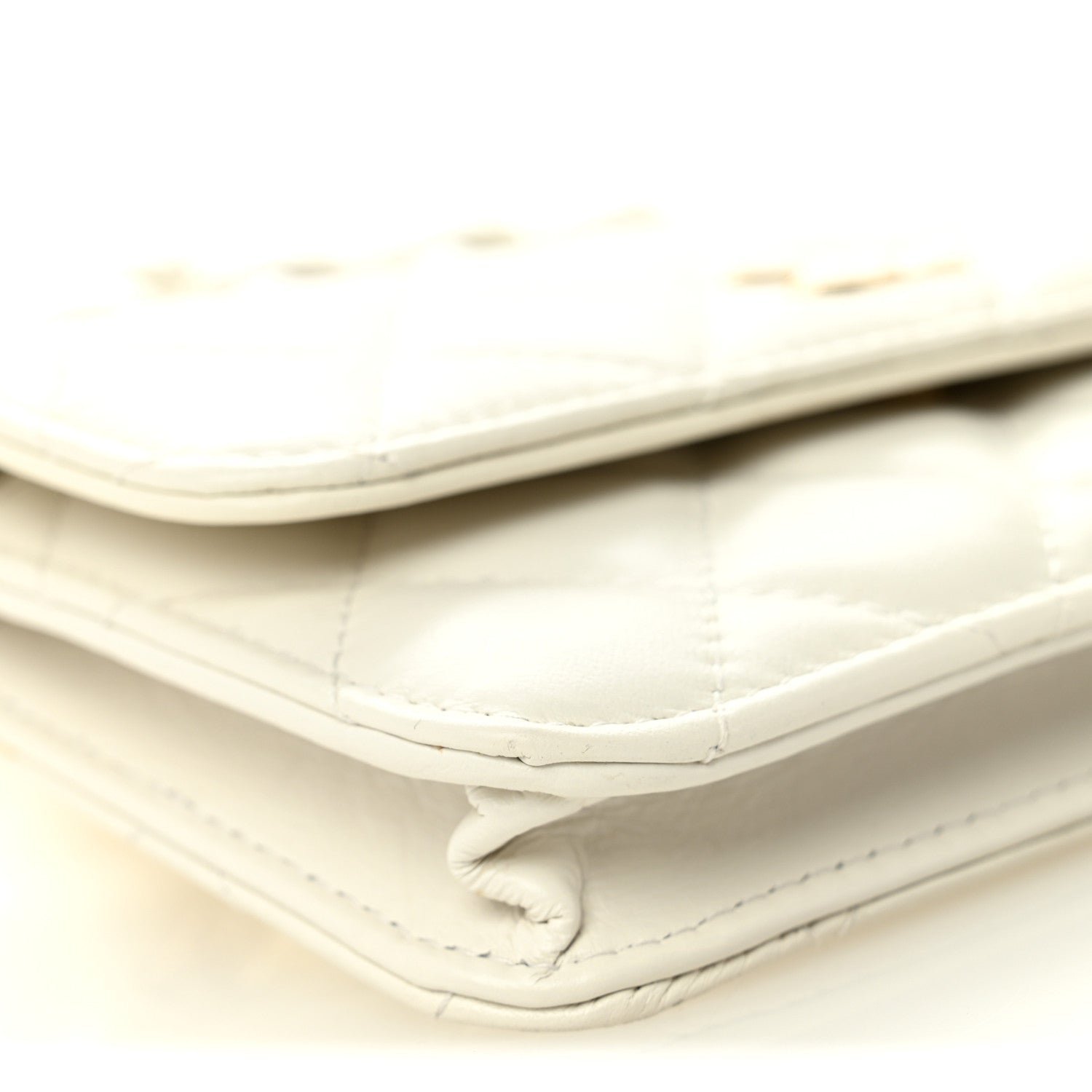 This specific model is crafted from white quilted calfskin leather, featuring the House’s classic diamond-stitched quilting. While many variations of this bag utilize lambskin, the calfskin version offers a slightly more durable grain while maintaining a soft, luxurious feel. The defining design element is the “Maxi Pearl” strap, which features oversized, Wilma Flintstone-inspired imitation pearls that serve as a bold, jewelry-like crossbody handle.