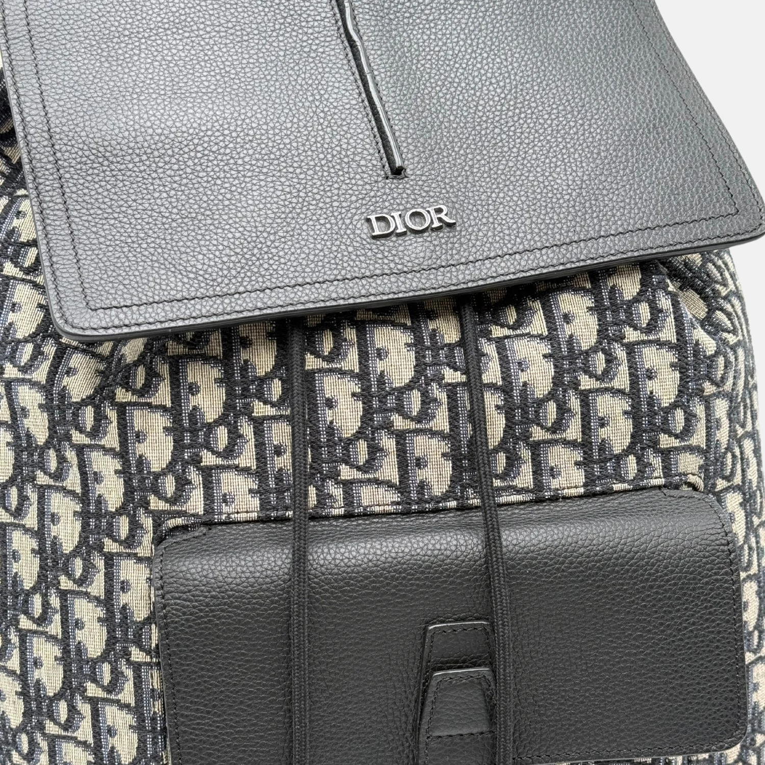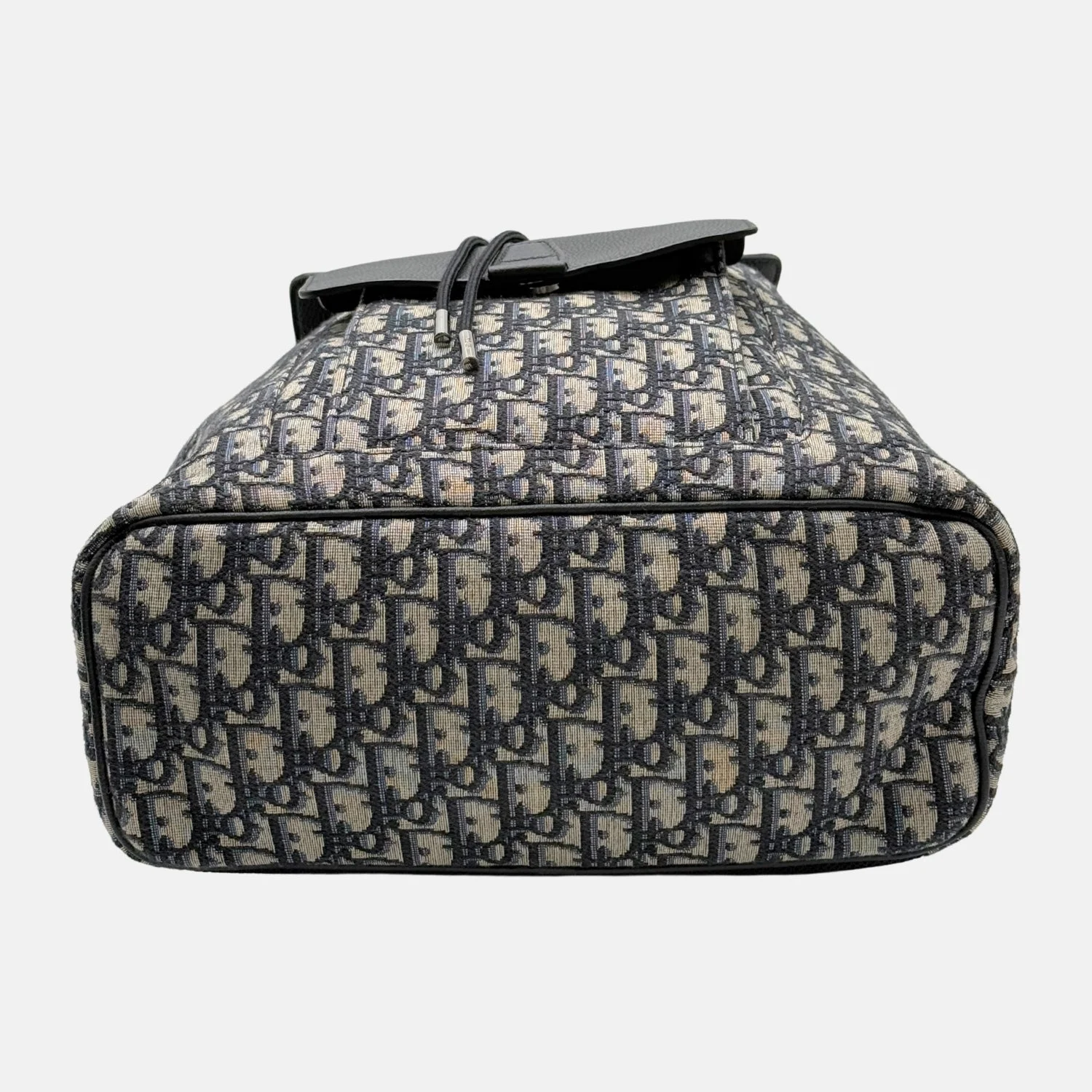 This is an authentic CHRISTIAN DIOR Oblique Motion Backpack in Blue. Designed for both style and practicality, this backpack is crafted from signature Dior Oblique canvas with smooth blue leather accents. It features a sturdy leather top handle, adjustable nylon shoulder straps, and sleek silver-tone hardware. The flap closure lifts to reveal a drawstring opening, leading to a spacious black fabric interior with a large patch pocket for easy organization. Perfect for everyday use, this backpack blends luxury with functionality.