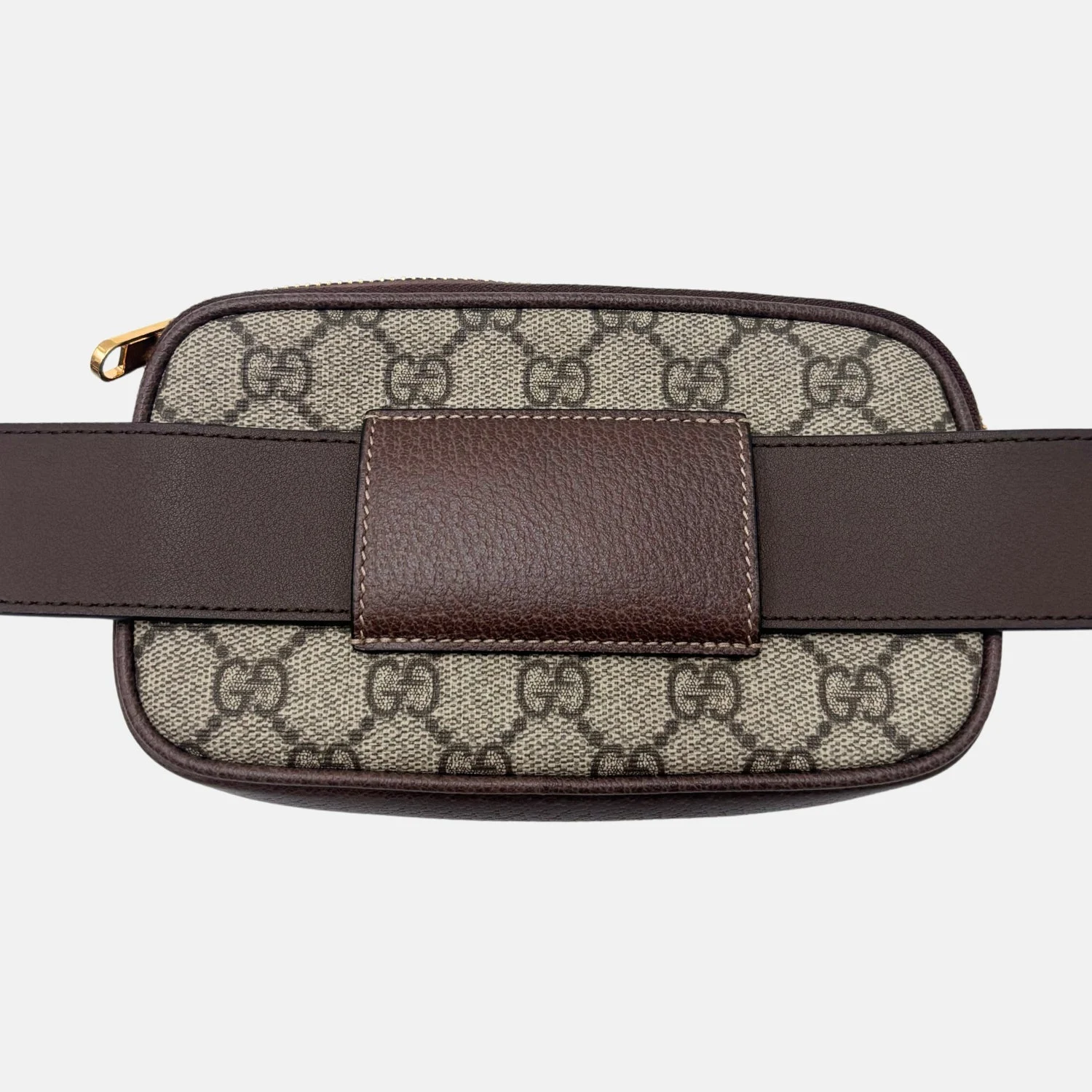 The Gucci Ophidia GG Supreme Belt Bag is crafted in beige and ebony GG Supreme canvas with brown leather trim and finished with gold-tone hardware. Featuring the house’s signature green and red Web stripe and Double G logo detail, this compact design blends archival motifs with a modern, functional silhouette.