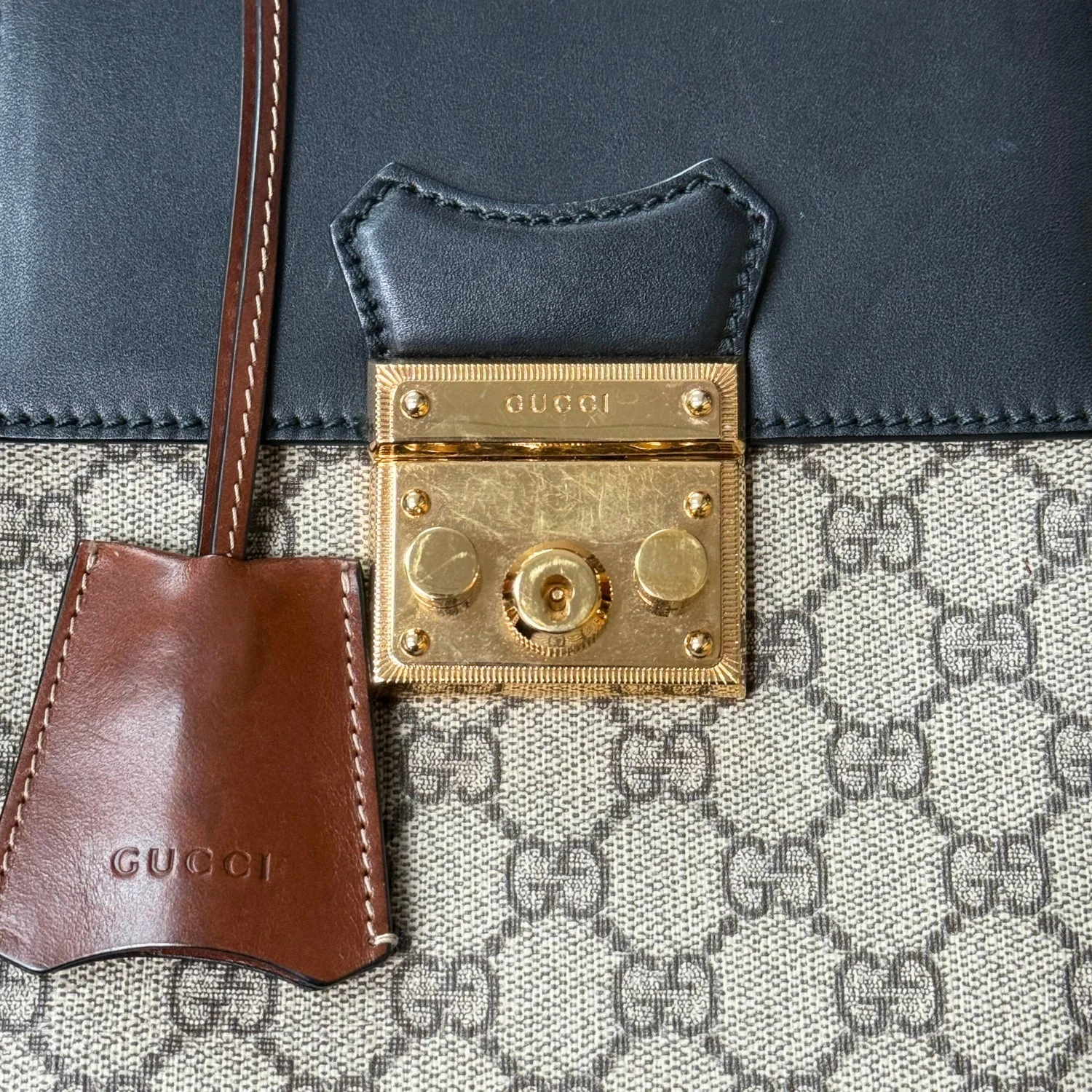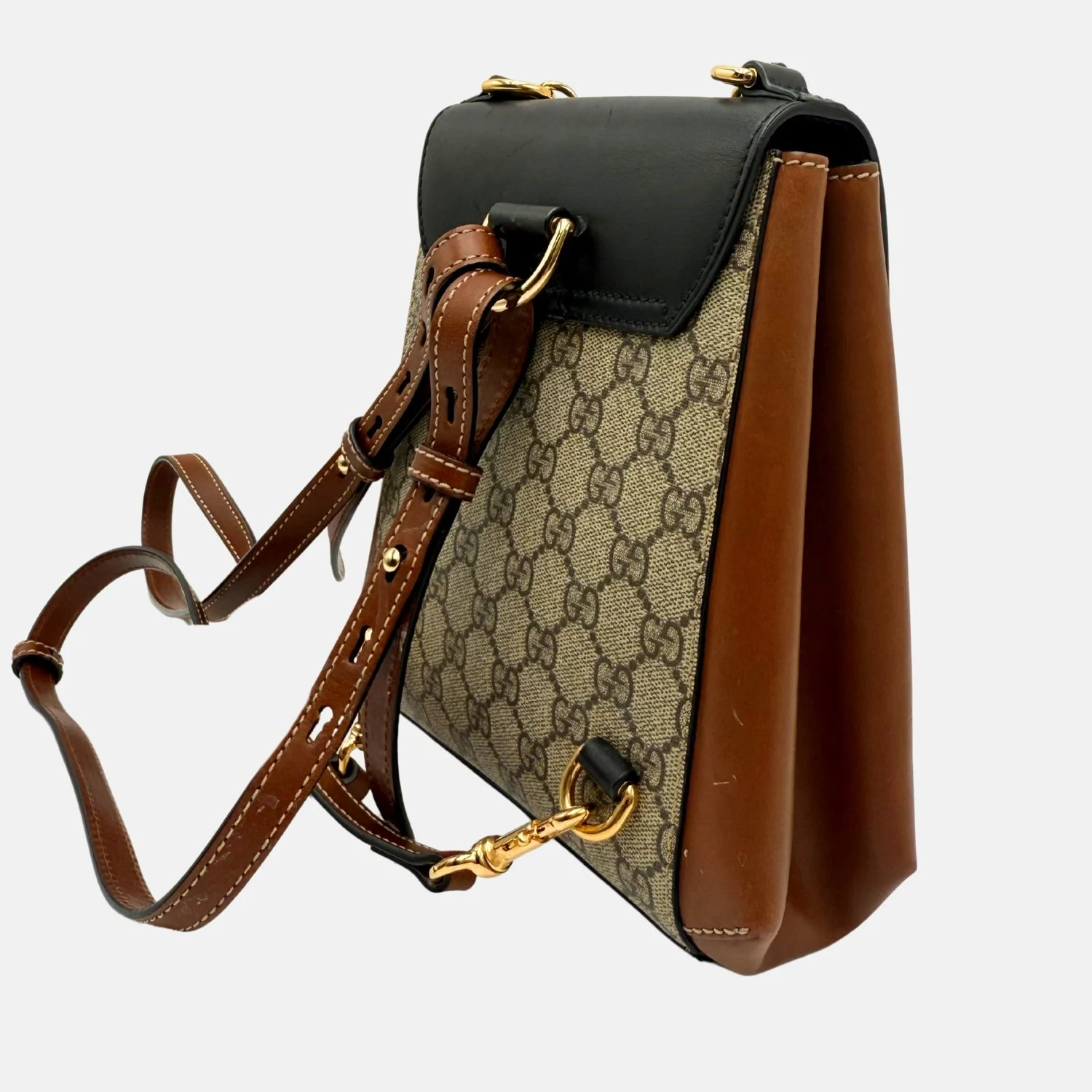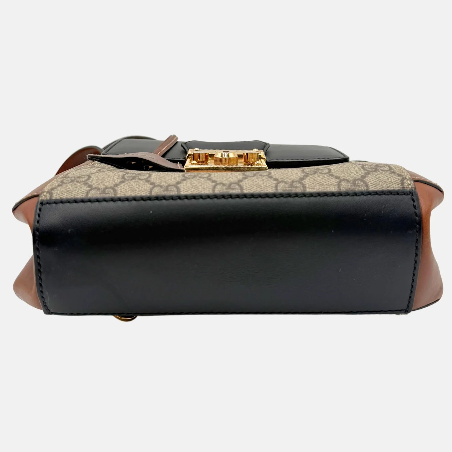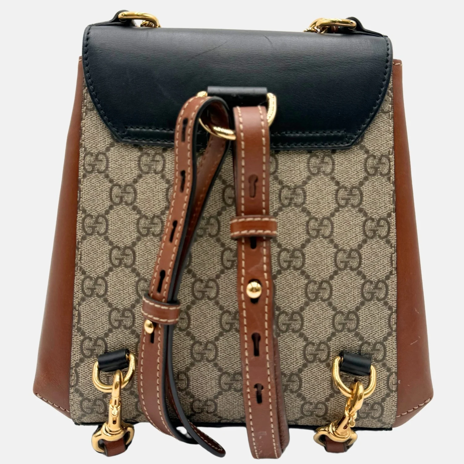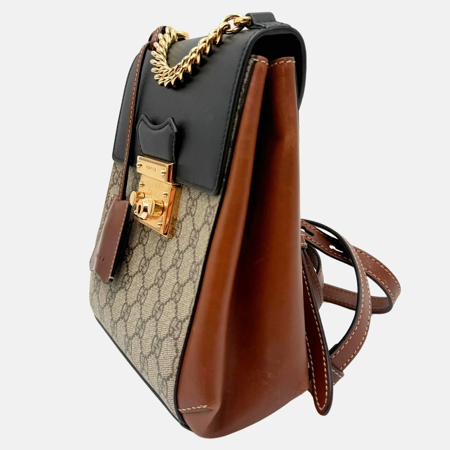 This is an authentic GUCCI Padlock Backpack GG Supreme Monogram Calfskin in Beige Cuir and Black. Crafted with a blend of GG Supreme coated canvas and smooth brown calfskin leather, this backpack exudes classic Gucci style. It features a polished gold chain top handle, adjustable brown leather shoulder straps, and a black leather crossover flap secured by a signature gold press-lock closure. The flap opens to a spacious brown microfiber-lined interior with patch pockets, offering both elegance and practicality for everyday use.
