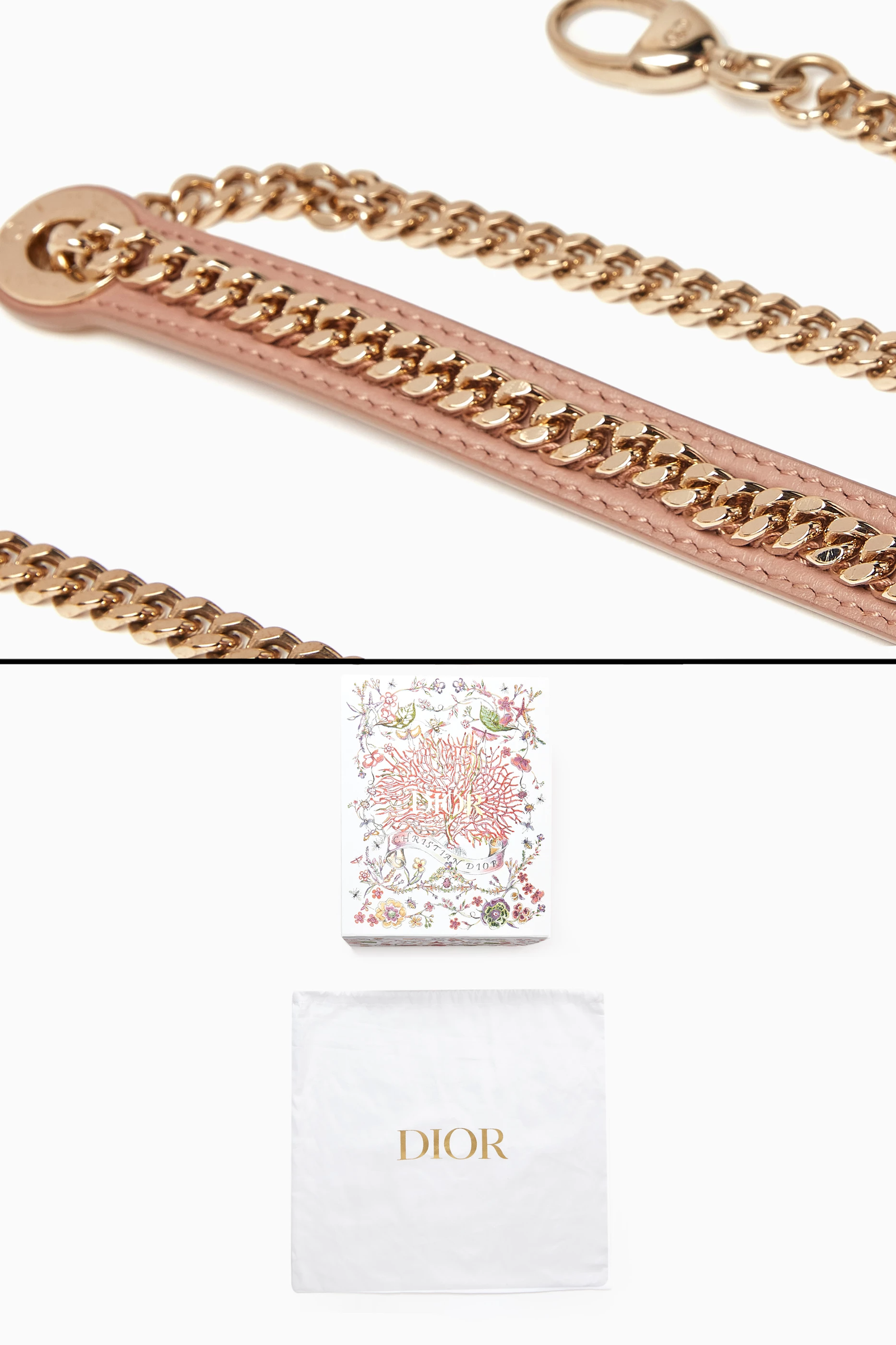 Hardware: Adorned with pale gold-finish metal D.I.O.R. charms.