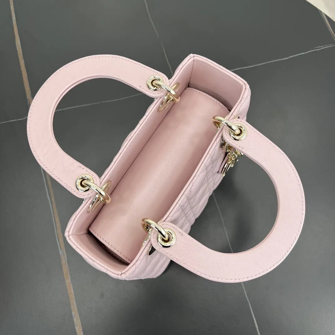 The Lady Dior bag embodies Dior’s vision of elegance and beauty. Sleek and refined, the timeless style is crafted in powder beige lambskin with Cannage stitching, creating the unmistakable quilted texture. Pale gold-finish metal D.I.O.R. charms embellish and illuminate its silhouette.