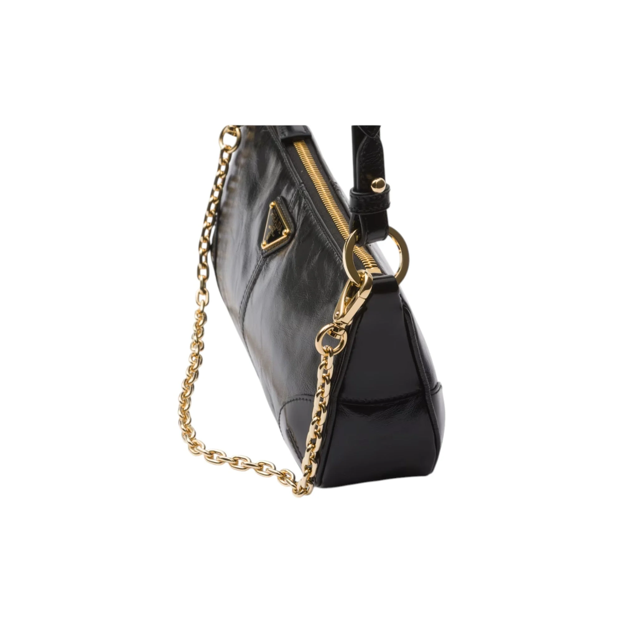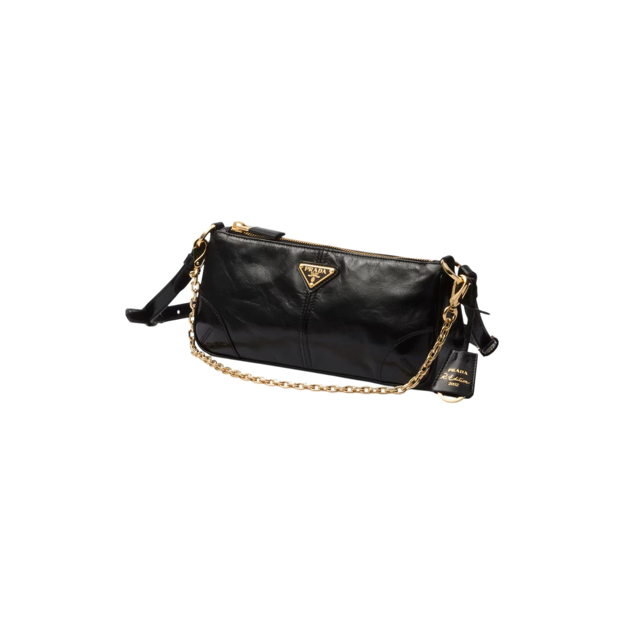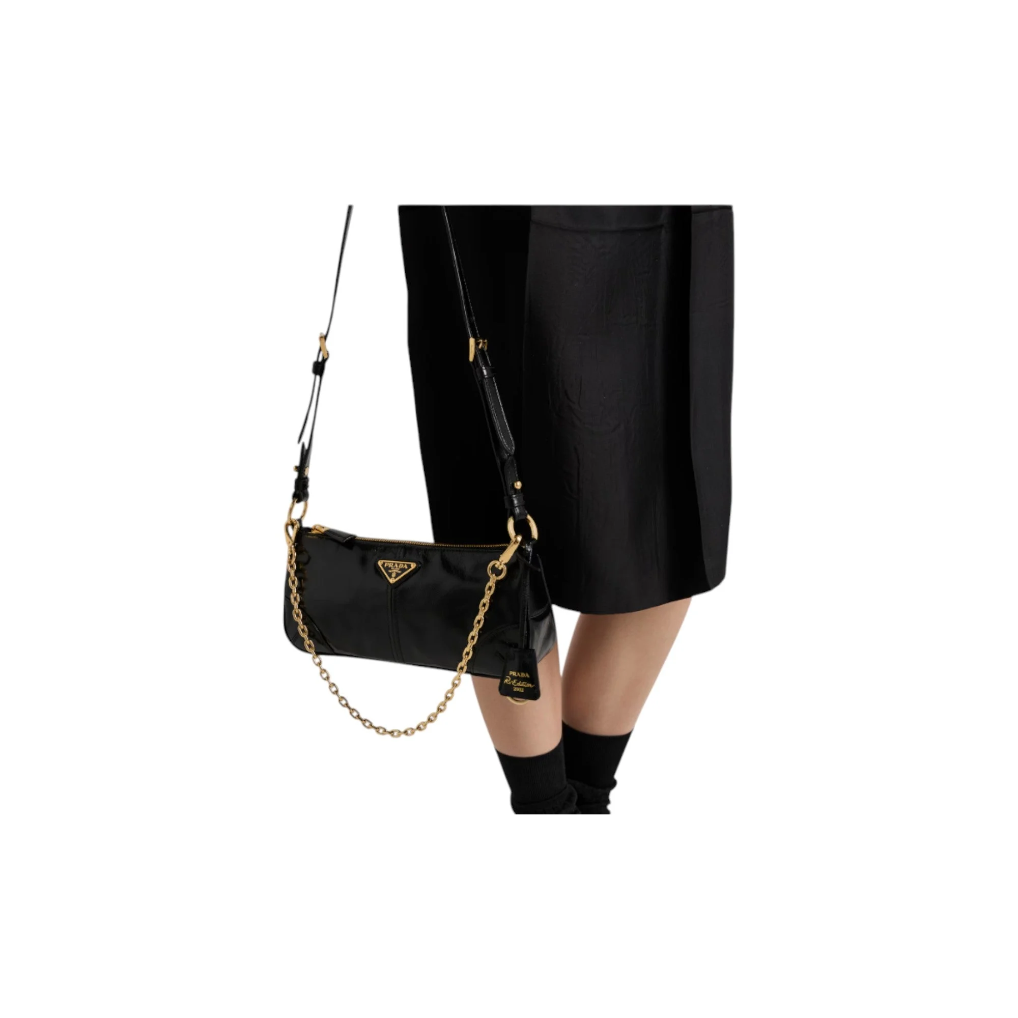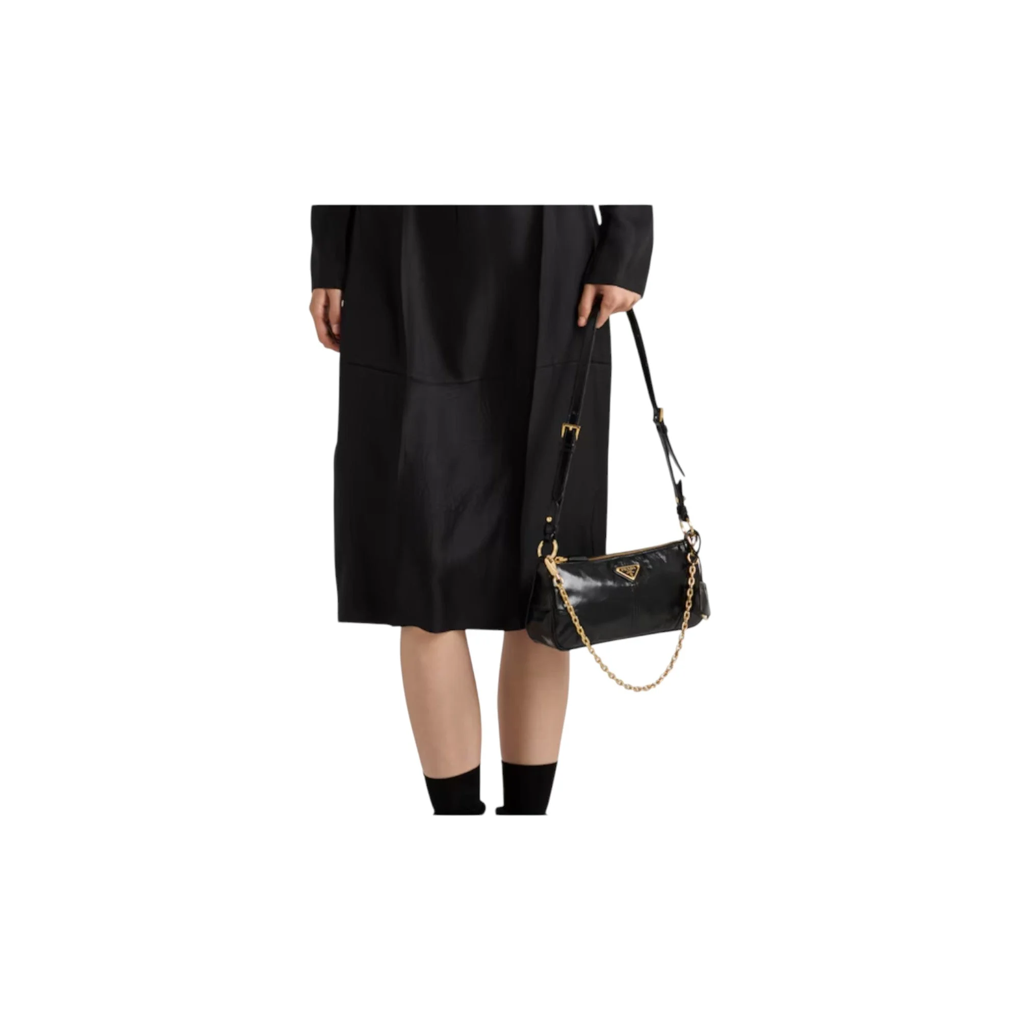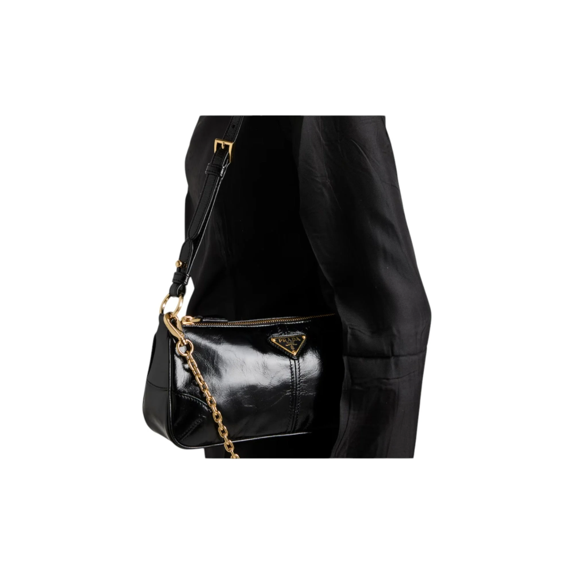 A revival of a Y2K classic, the Prada Re-Edition 2002 shoulder bag bridges archival heritage and modern refinement. Crafted in glossy black calfskin, this minimalist silhouette is accented with luxe metal hardware and Prada’s signature enameled triangle logo. The removable chain and adjustable leather strap offer versatile styling from day to night.