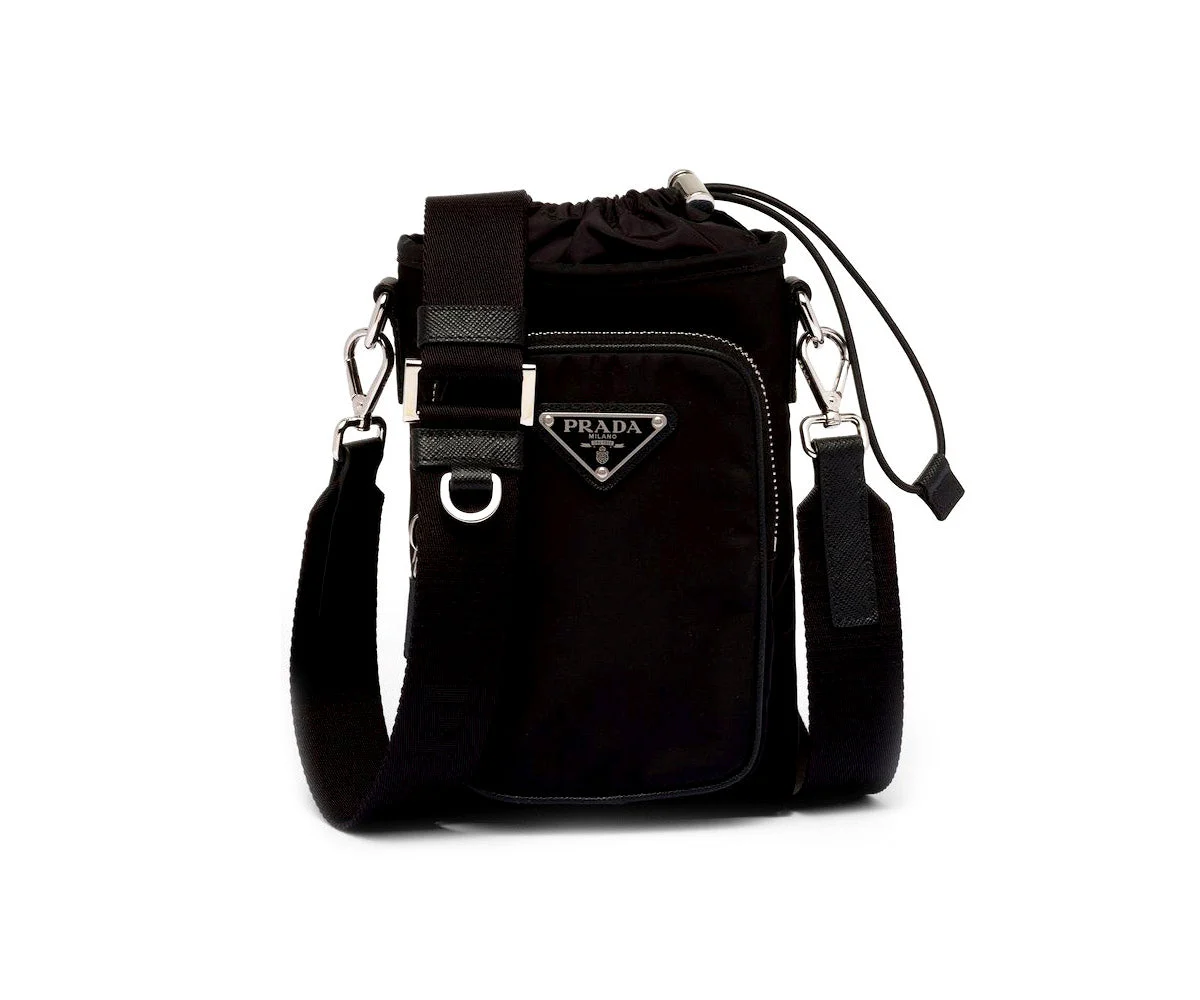 - This smartphone case made of innovative Re-Nylon expresses a modern, urban character. The accessory is distinguished by the adjustable woven nylon tape shoulder strap and drawstring closure. The front is decorated with the iconic enameled metal triangle logo.