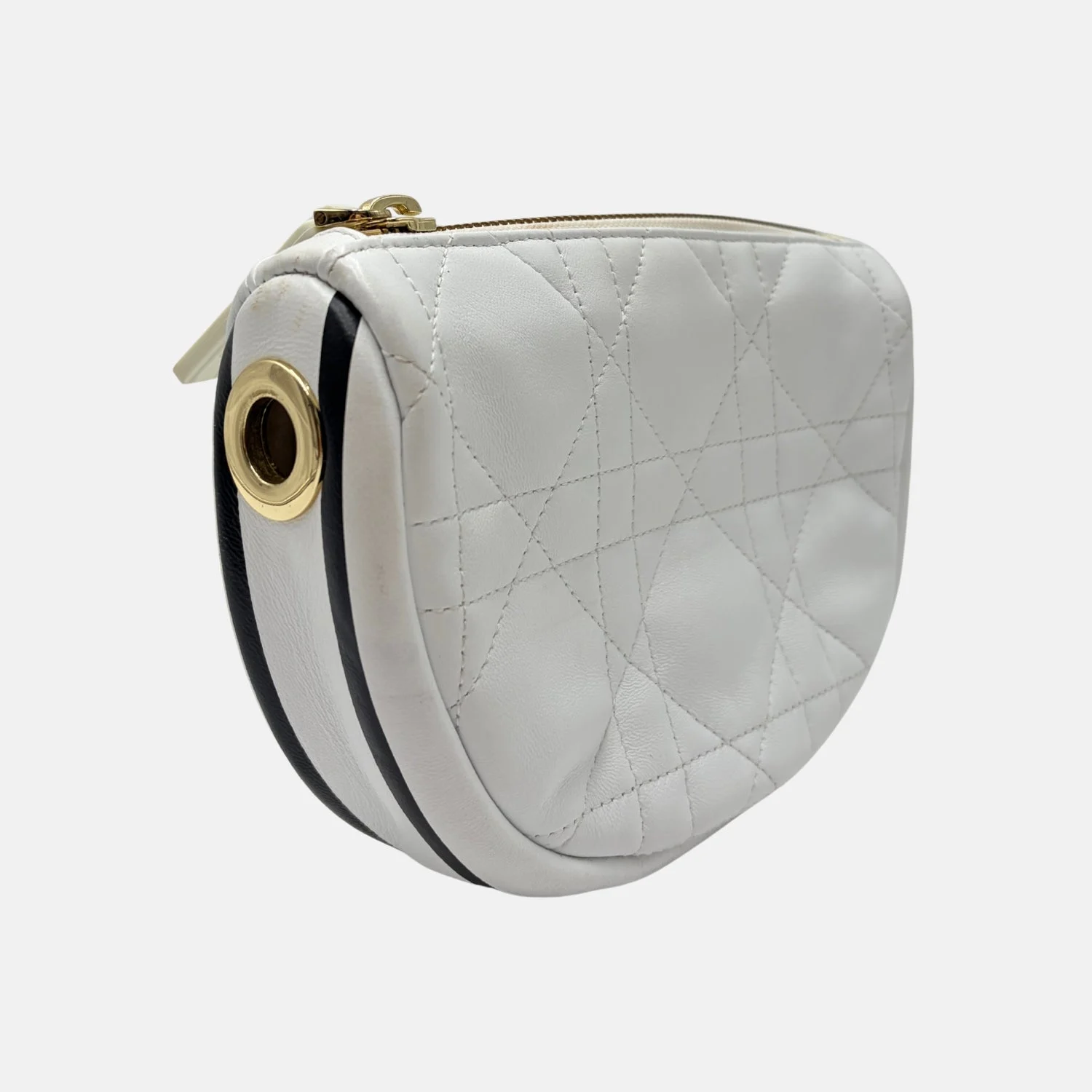 The Dior Vibe Hobo Bag Small is crafted in white cannage-stitched calfskin leather and finished with gold-tone hardware. Designed with a curved silhouette, zip-top closure, and tonal detailing, this modern piece combines the house’s heritage quilting with a contemporary, sporty edge.