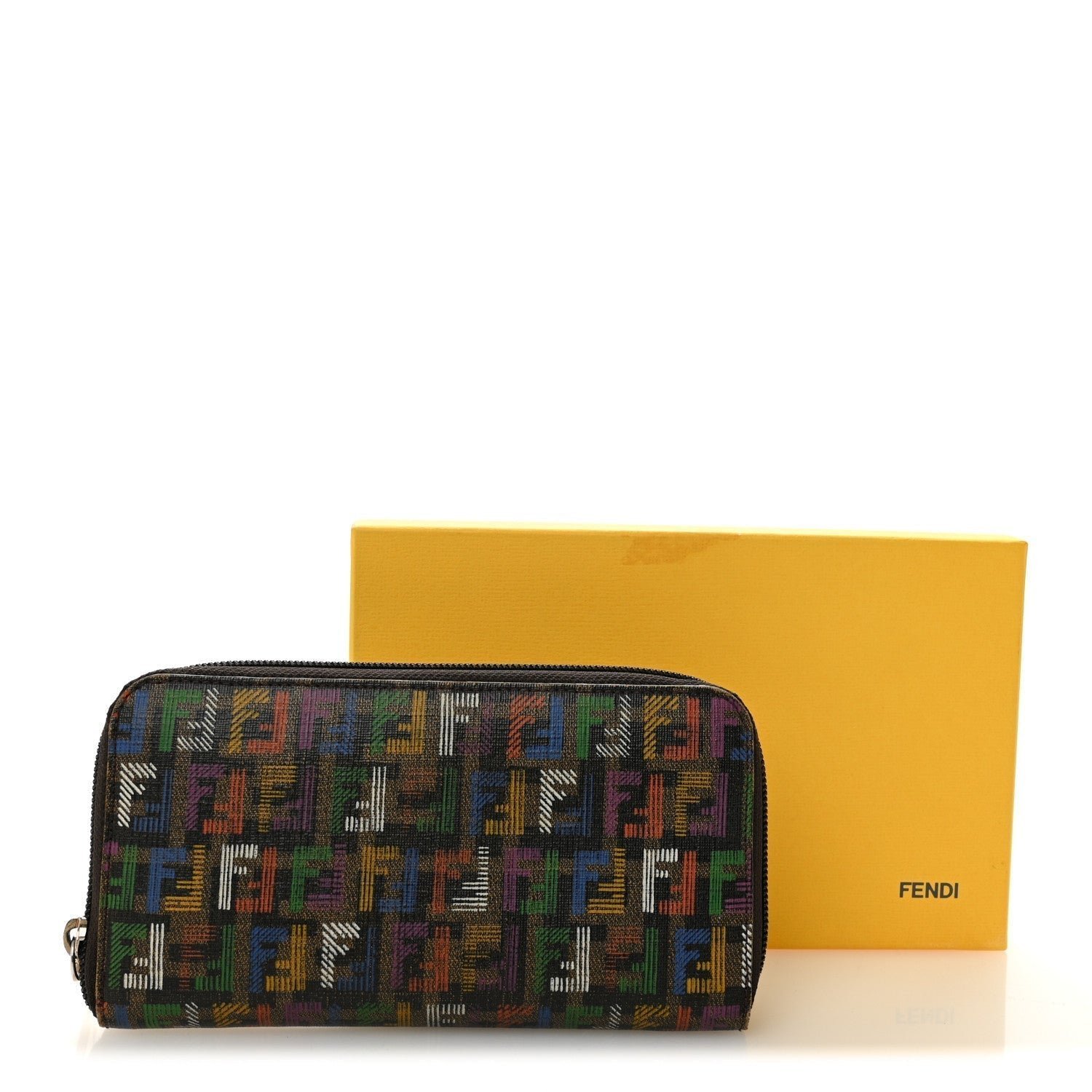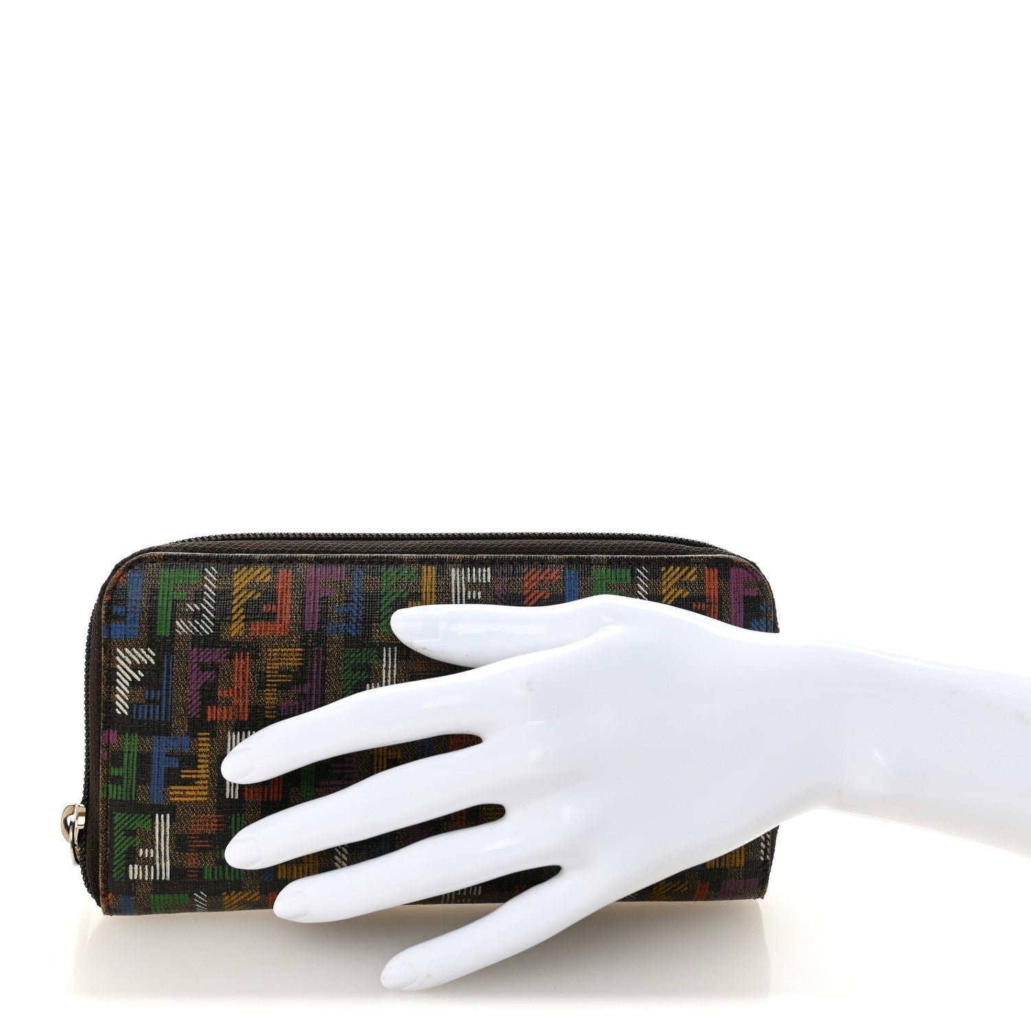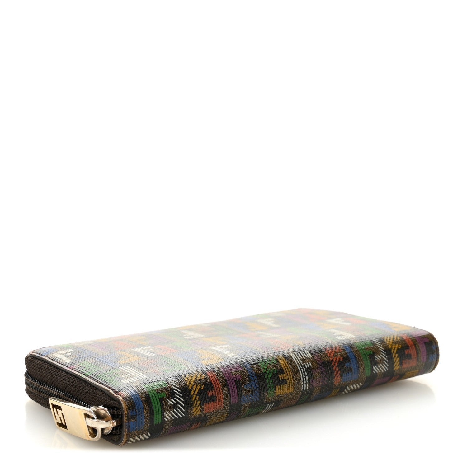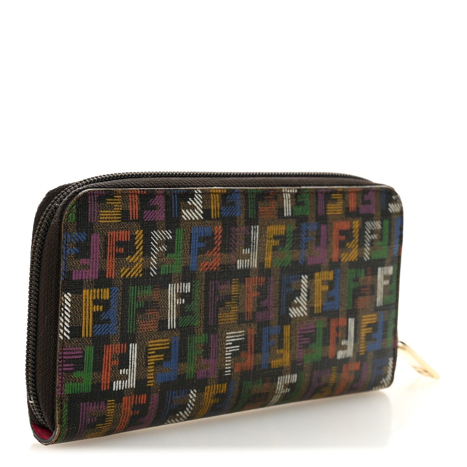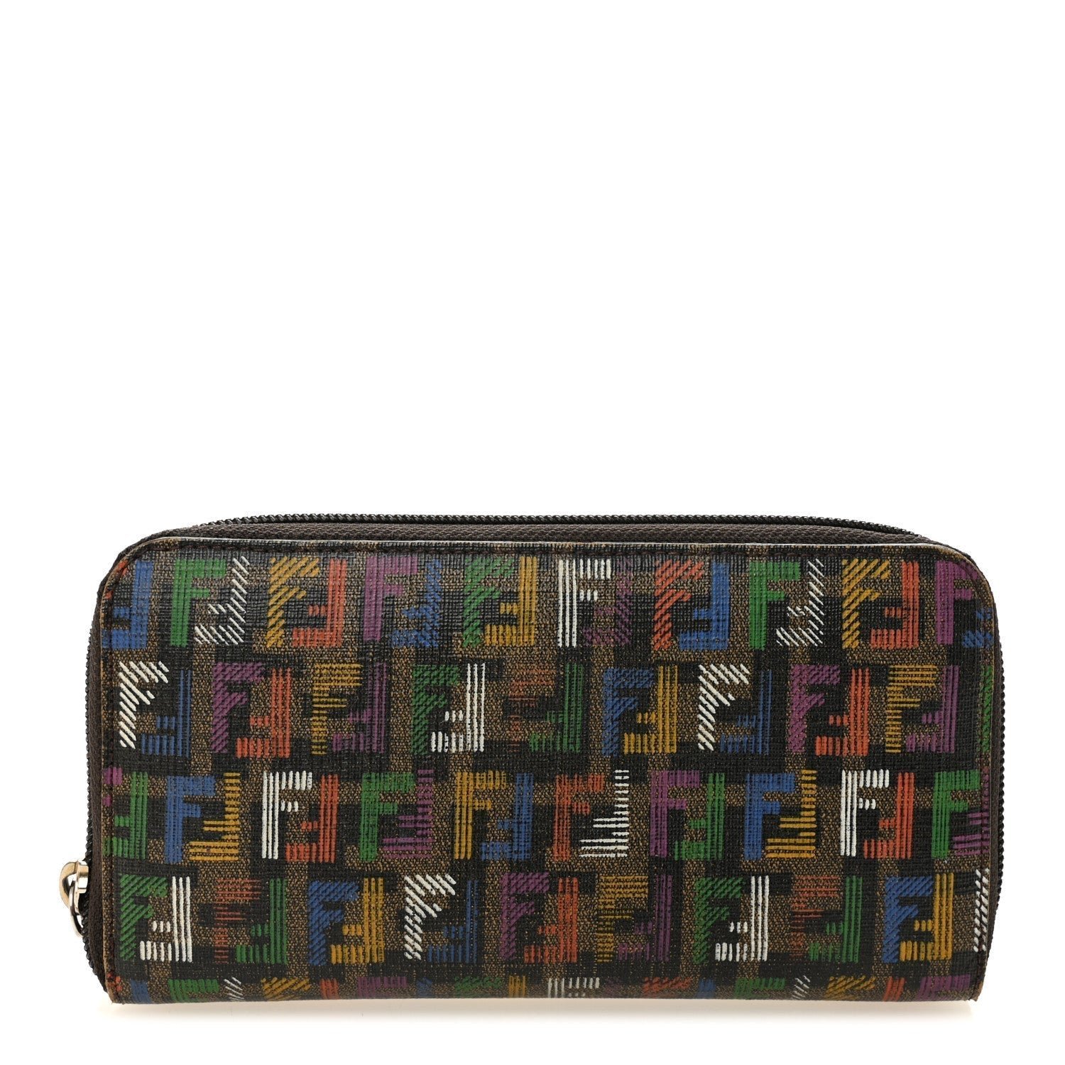 A vibrant and artistic take on Fendi’s heritage, this zip-around wallet is crafted from durable Spalmati (coated) canvas. It features the iconic Zucchino mini-monogram pattern reimagined with a playful “Sketch” or “Crayon” effect. The hand-drawn aesthetic utilizes a bold palette of green, blue, yellow, red, and purple against a sleek black and tobacco background, making it a standout statement accessory.